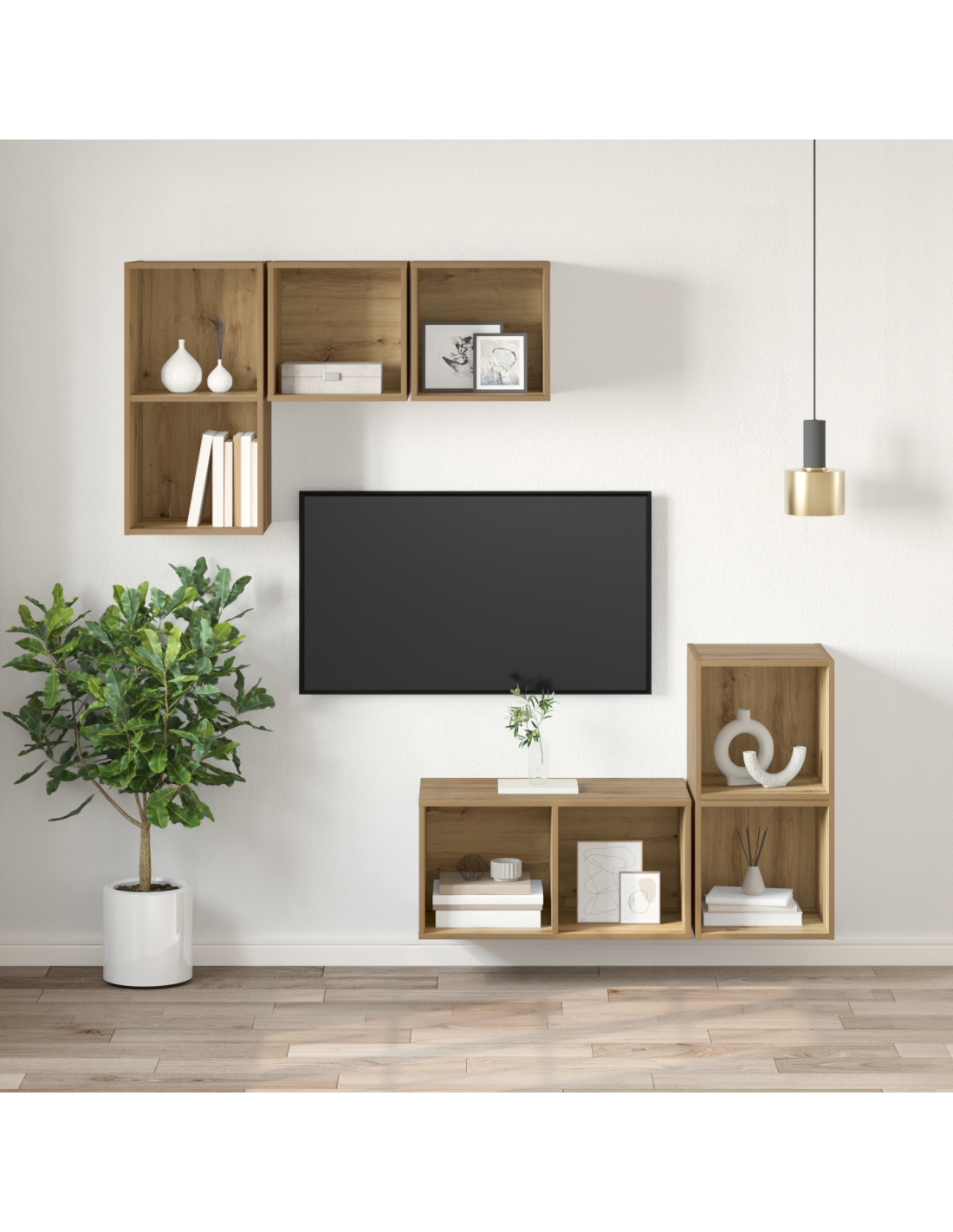 - Componenti inclusi: Con mensole versatili in legno, questo set offre opzioni pratiche per organizzare la tua attrezzatura multimediale e decorazioni. Ogni ripiano è robusto e sostiene vari pesi, mentre il retro, non rifinito, rimane nascosto, mantenendo tutto in ordine.