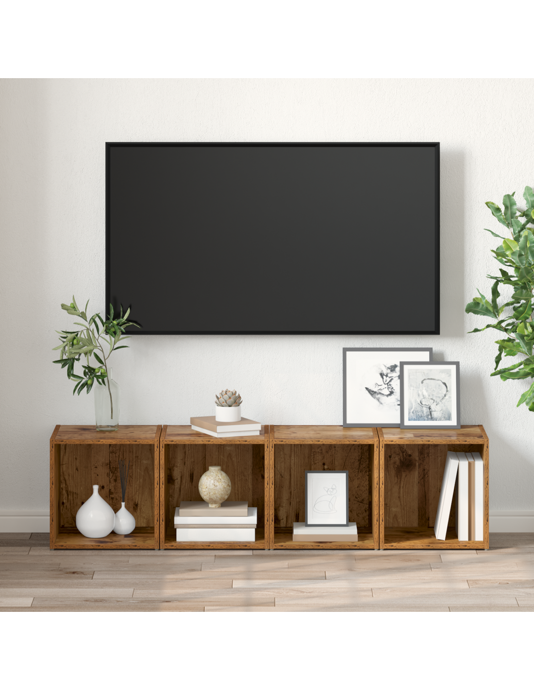 Questo set di mobili per TV a parete unisce funzionalità e design rustico, portando stile e ordine in soggiorno. Misura 37 x 35 x 37.5 cm e offre tanto spazio riducendo l'ingombro a terra. La sua configurazione a parete è perfetta per gli spazi moderni, fornendo comodità e un bel colpo d'occhio, adattandosi perfettamente sotto il televisore piatto.