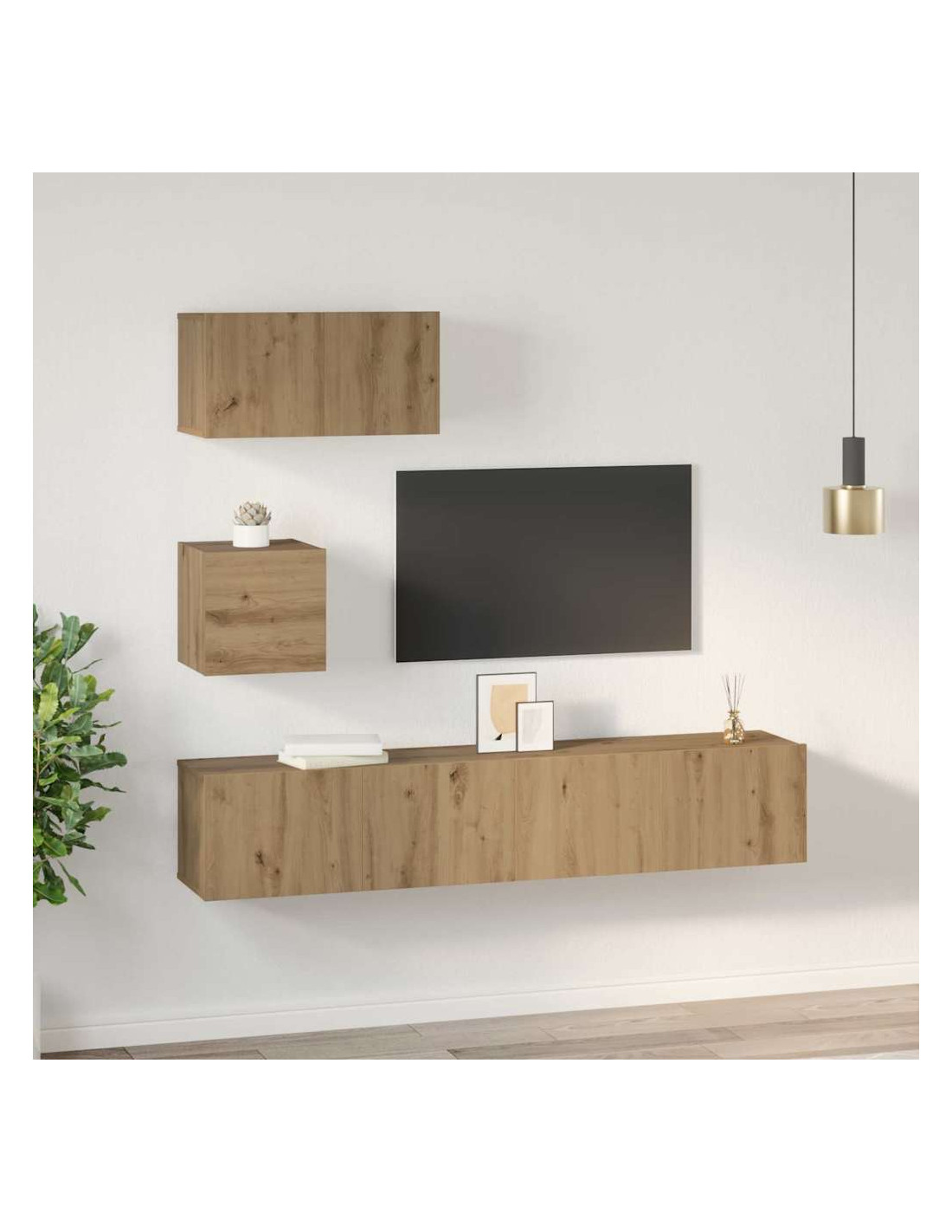 Questo set di mobili TV arricchisce qualsiasi spazio con un tocco elegante e moderno, offrendo pratiche soluzioni di stoccaggio. Il design a parete salva spazio e crea un aspetto armonioso, perfetto per chi vive in città o per quelli che amano uno stile minimalista. Grazie a questo set, gli oggetti essenziali sono sempre riposti in modo ordinato, mantenendo le stanze pulite e organizzate. Le linee semplici e il design essenziale non solo offrono stoccaggio, ma aggiungono anche un elemento di stile alla tua casa, mostrando un buon gusto moderno.