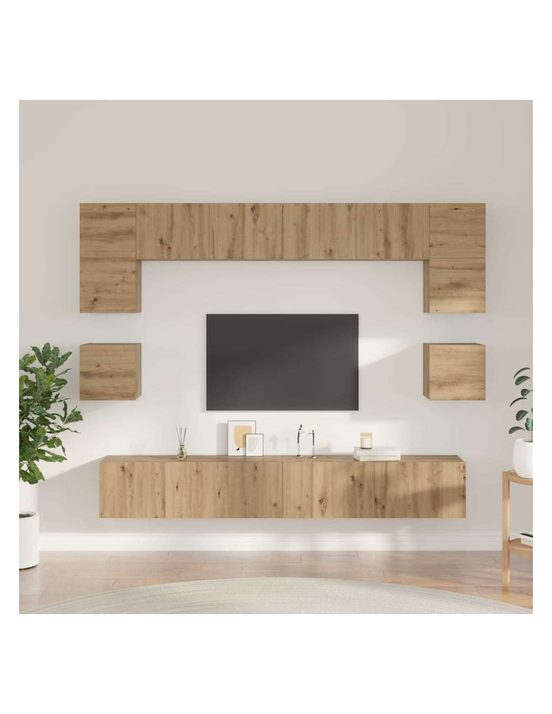 Questo set di armadi per TV a parete aggiunge un tocco moderno e praticità al tuo soggiorno. Con linee pulite e uno stile minimal, si integra facilmente nei tuoi interni, offrendo sia estetica che funzionalità. Il suo design a parete non migliora solo l'aspetto, ma ottimizza anche lo spazio disponibile, rendendolo perfetto per chi ha poco spazio.