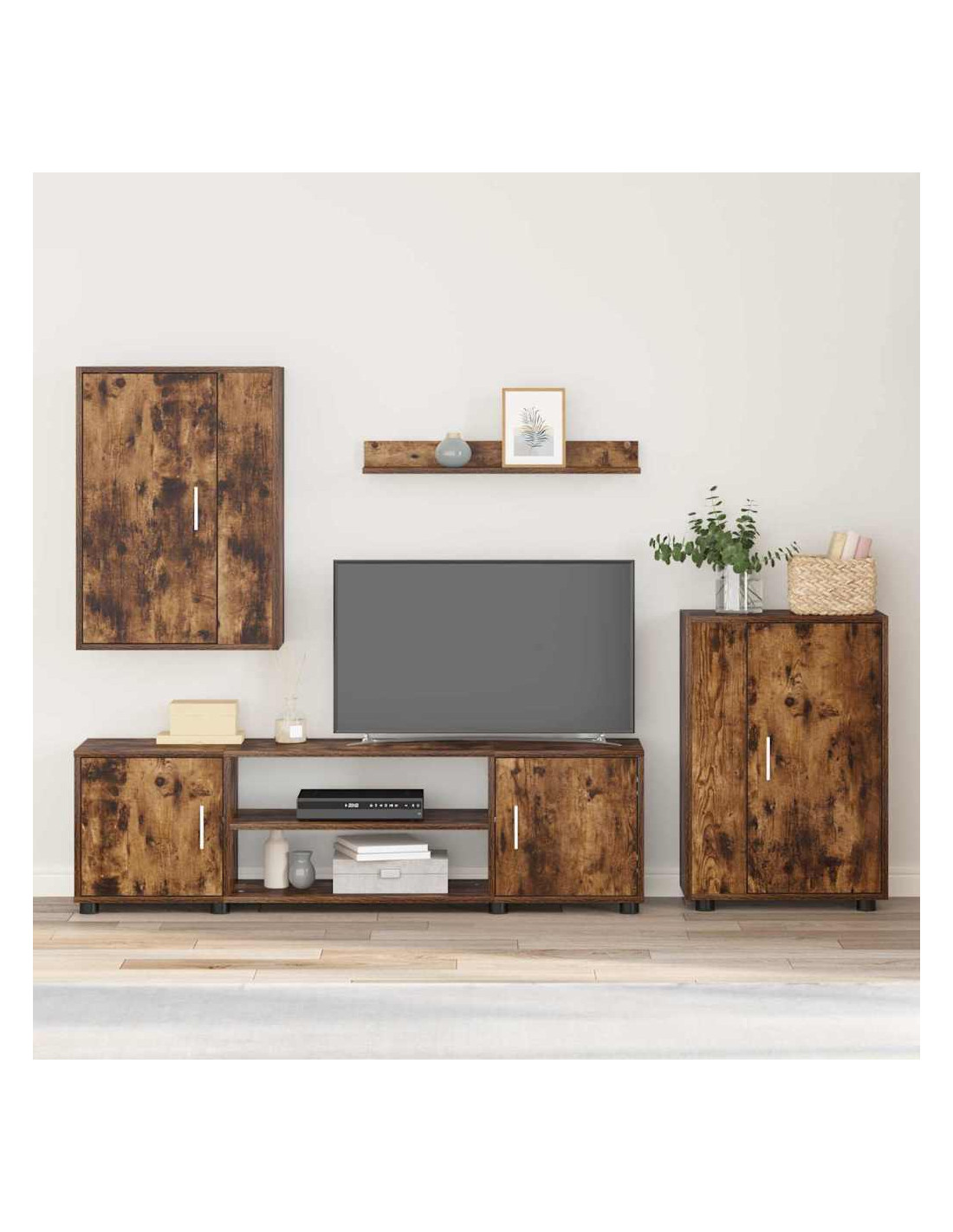 - Set di componenti completo Il set comprende un supporto per TV, un armadio indipendente, uno a parete e una mensola, tutti progettati per avere un living più ordinato. Questi pezzi si uniscono per migliorare la funzionalità e l'estetica.