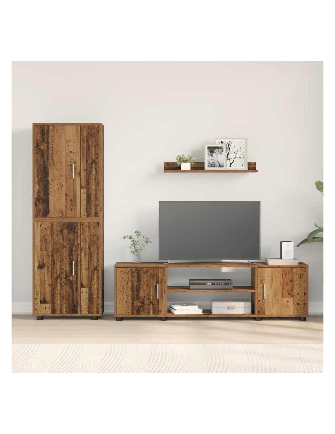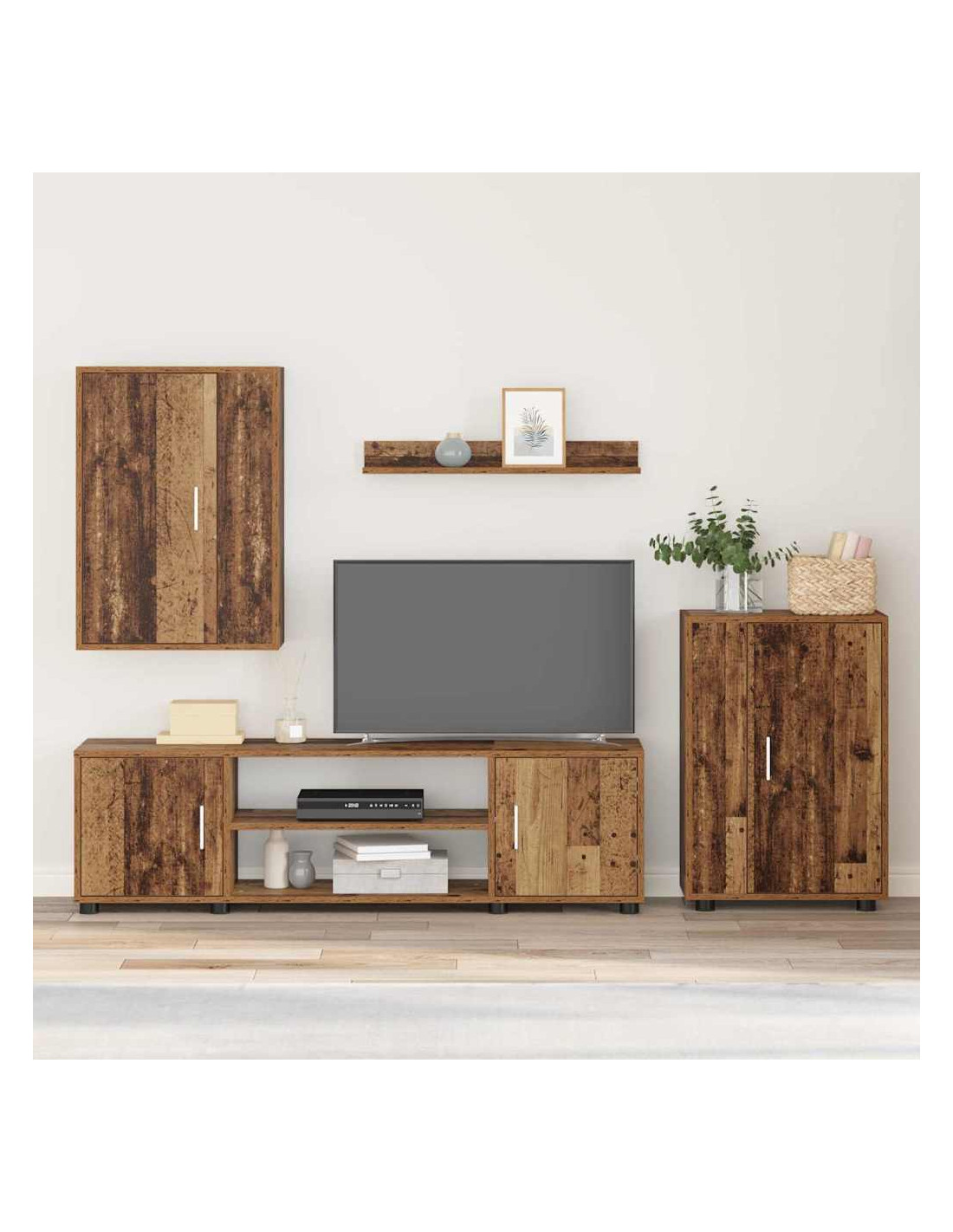 - Set di componenti completo Il set comprende un supporto per TV, un armadio indipendente, uno a parete e una mensola, tutti progettati per avere un living più ordinato. Questi pezzi si uniscono per migliorare la funzionalità e l'estetica.