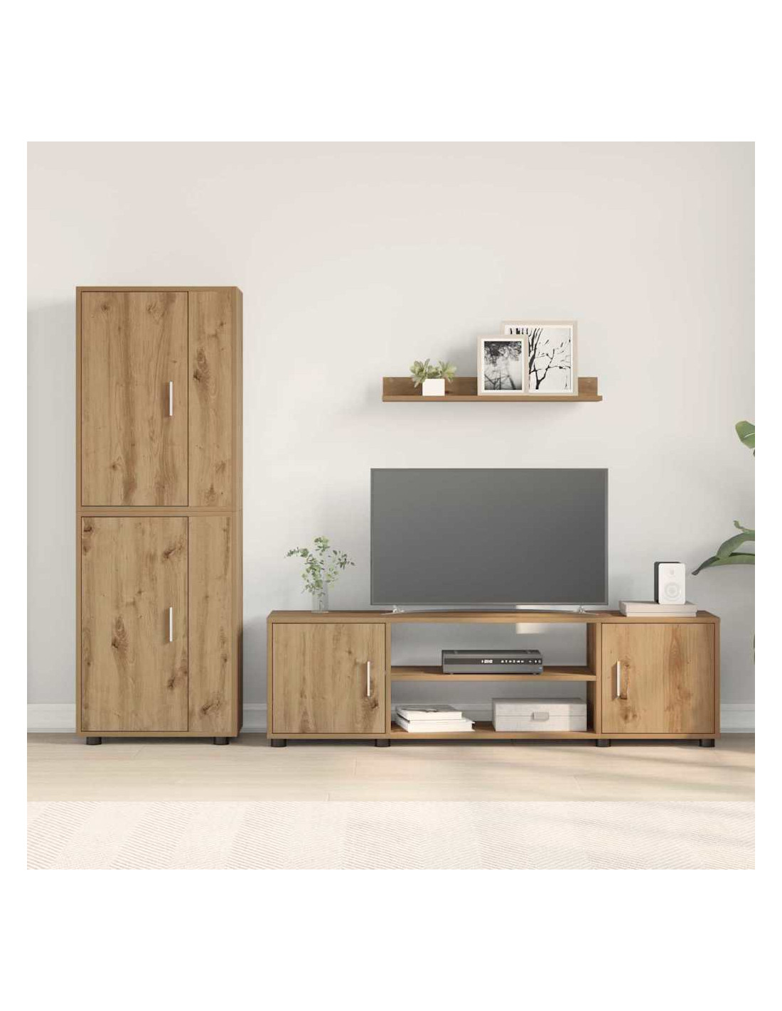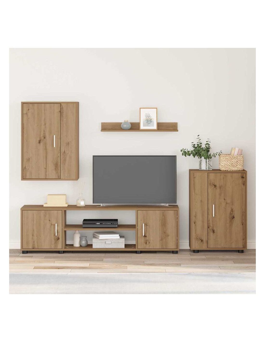 Questo set di armadi a parete per TV ha un look moderno con linee pulite e tanta praticità. Perfetto per gli interni, offre stile e soluzioni di stoccaggio usando legno ingegnerizzato, bello da vedere e funzionale. Progettato per sfruttare al massimo il tuo soggiorno, questo set include componenti versatili per soddisfare diverse esigenze di stoccaggio.
