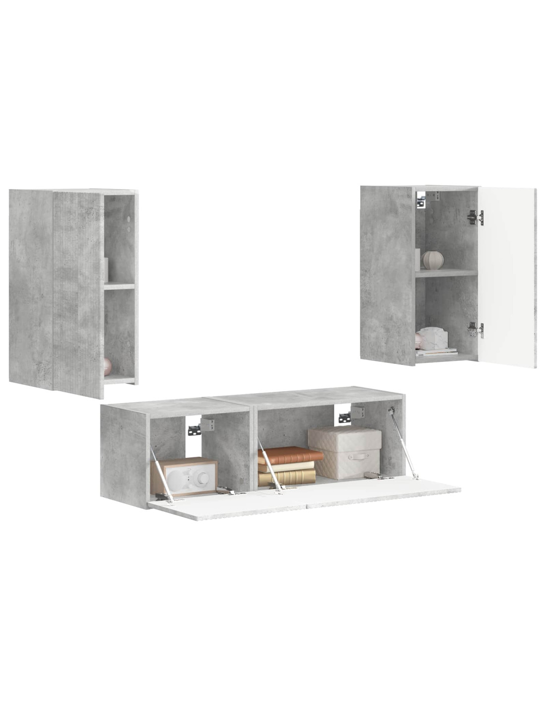 Questo set di mobili per TV è la soluzione ideale per le tue esigenze di archiviazione, grazie al suo design moderno e slanciato. Perfetto per il soggiorno, il suo montaggio a parete si integra nel tuo spazio senza occupare superficie preziosa. Realizzato in legno ingegnerizzato, offre un bell'aspetto e resistenza, rendendolo una scelta pratica per gli ambienti contemporanei. Le porte a cerniera girevole a 90° assicurano un accesso semplice e ampio spazio di archiviazione per tutti i tuoi dispositivi multimediali.