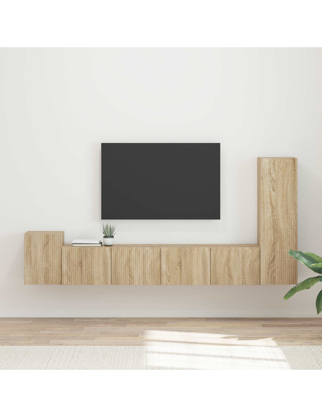 - Costruzione: Realizzato in legno ingegnerizzato, questo set di mobili TV è robusto e stabile. È resistente all'usura quotidiana, combinando resistenza con una finitura elegante, per una bellezza duratura. La scelta di questo materiale evidenzia anche sostenibilità e design intelligente.