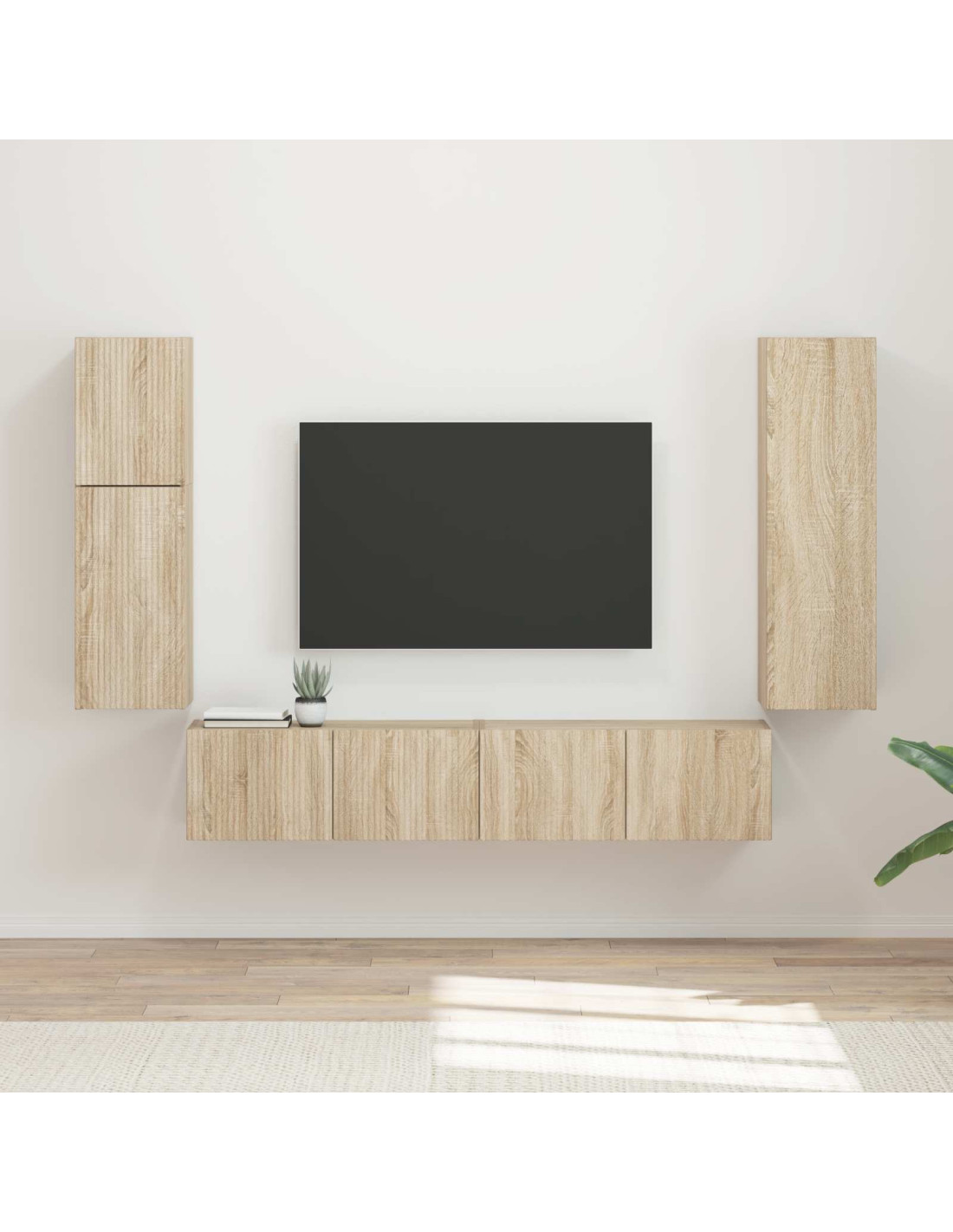 Questo set di mobili TV moderni è l'aggiunta perfetta per ogni soggiorno, con le sue linee pulite e stilose. Progettato per massimizzare funzionalità e stile, trasformerà il tuo spazio in un rifugio ordinato. È in legno ingegnerizzato, quindi è resistente ma leggero. Comprende armadietti a muro di diverse dimensioni, così puoi sfruttare al meglio il tuo spazio e mantenere tutto in ordine. Ideale per chi ama sia il design che la praticità, questo set si integra perfettamente in interni moderni.