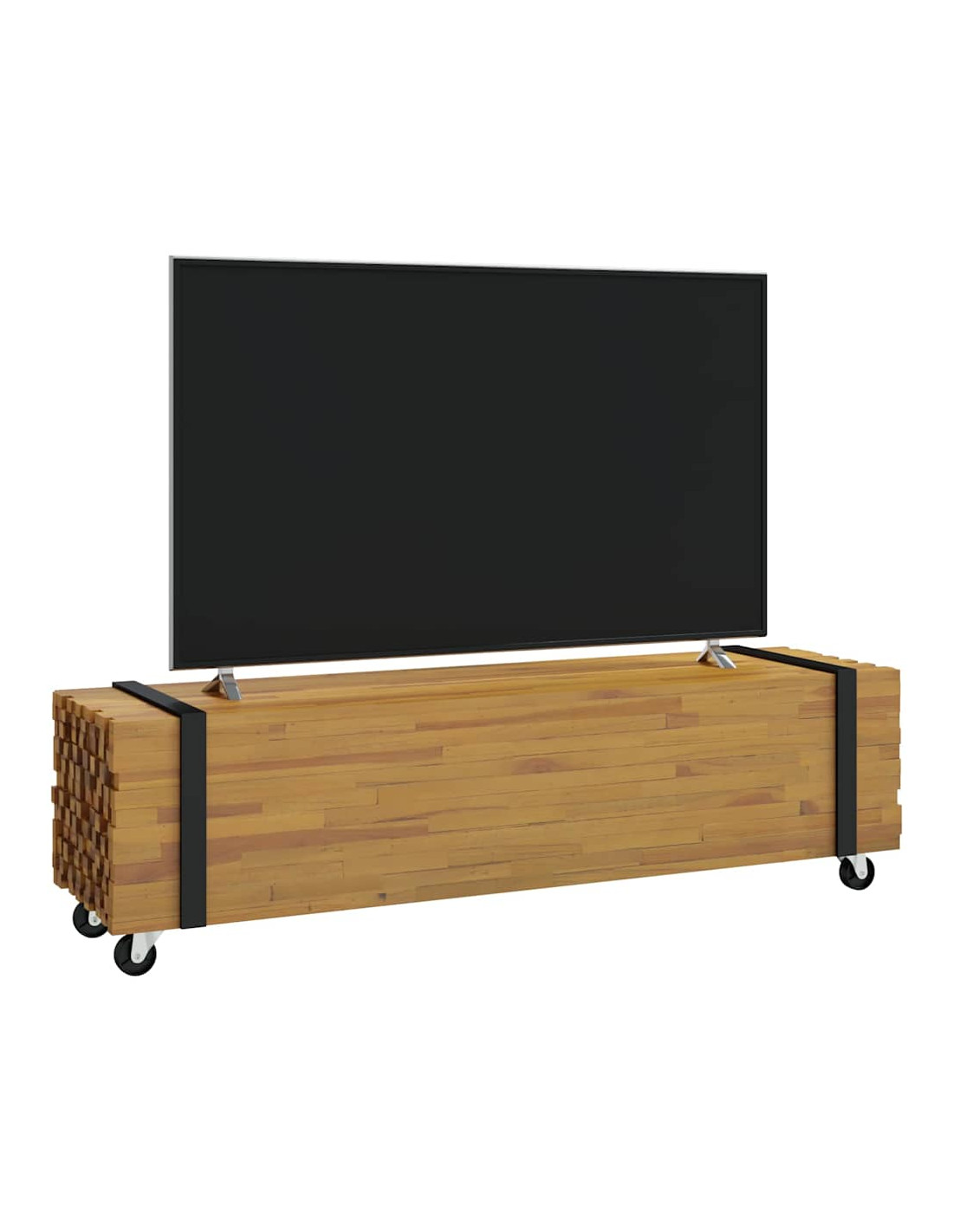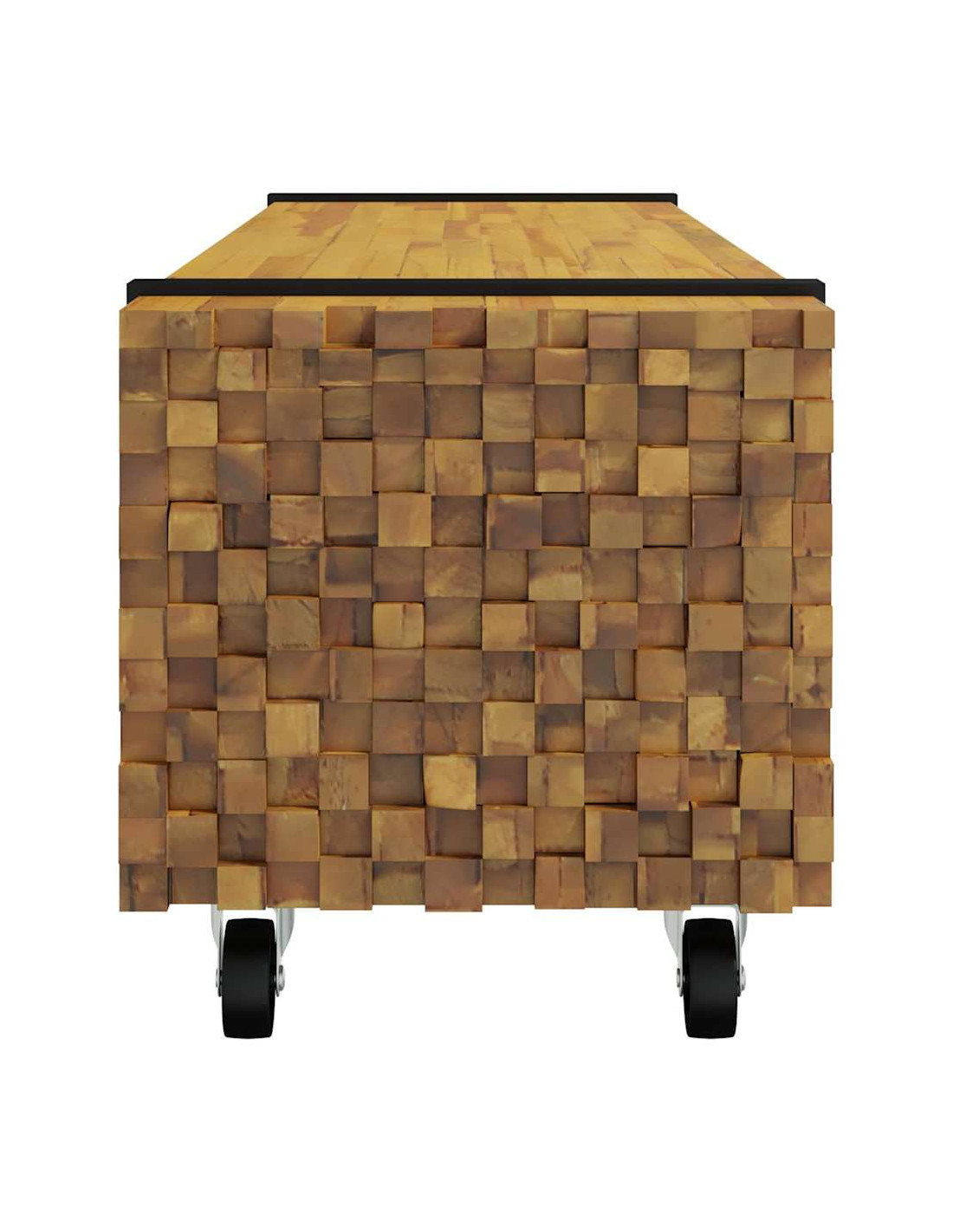Questo supporto per TV moderno è un equilibrio perfetto tra semplicità e funzionalità, progettato per abbellire qualsiasi soggiorno con il suo stile elegante. Creato per ospitare vari dispositivi di intrattenimento, è fatto di legno massello di teak di colore marrone caldo, arricchito da una texture fantastica. La forma rettangolare offre massima utilità e si integra senza problemi ne