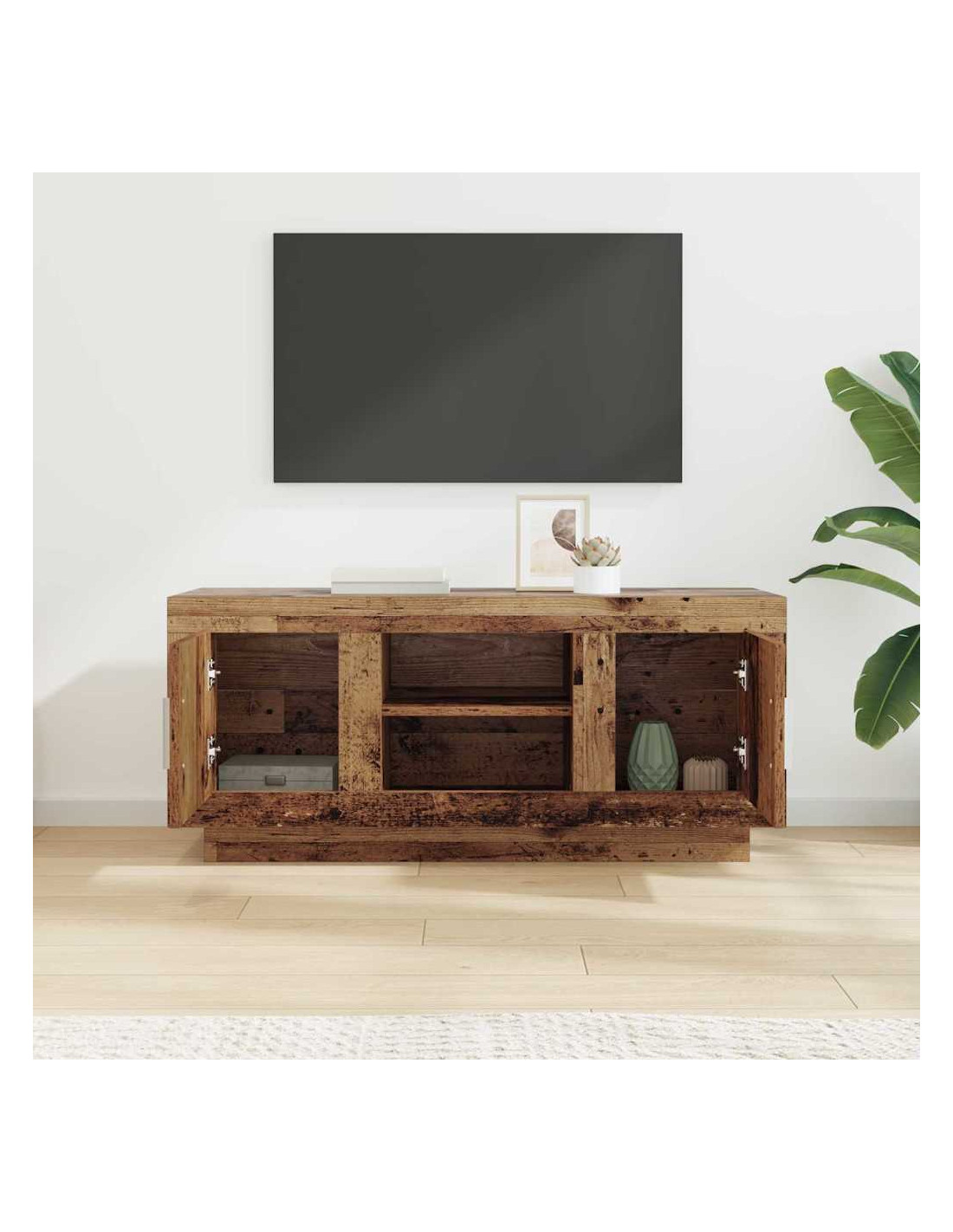 - Materiali: Questo mobile TV è fatto principalmente di legno ingegnerizzato, progettato per essere resistente e duraturo. È scelto per la sua uniformità, offrendo un aspetto coerente anche con l'uso quotidiano.