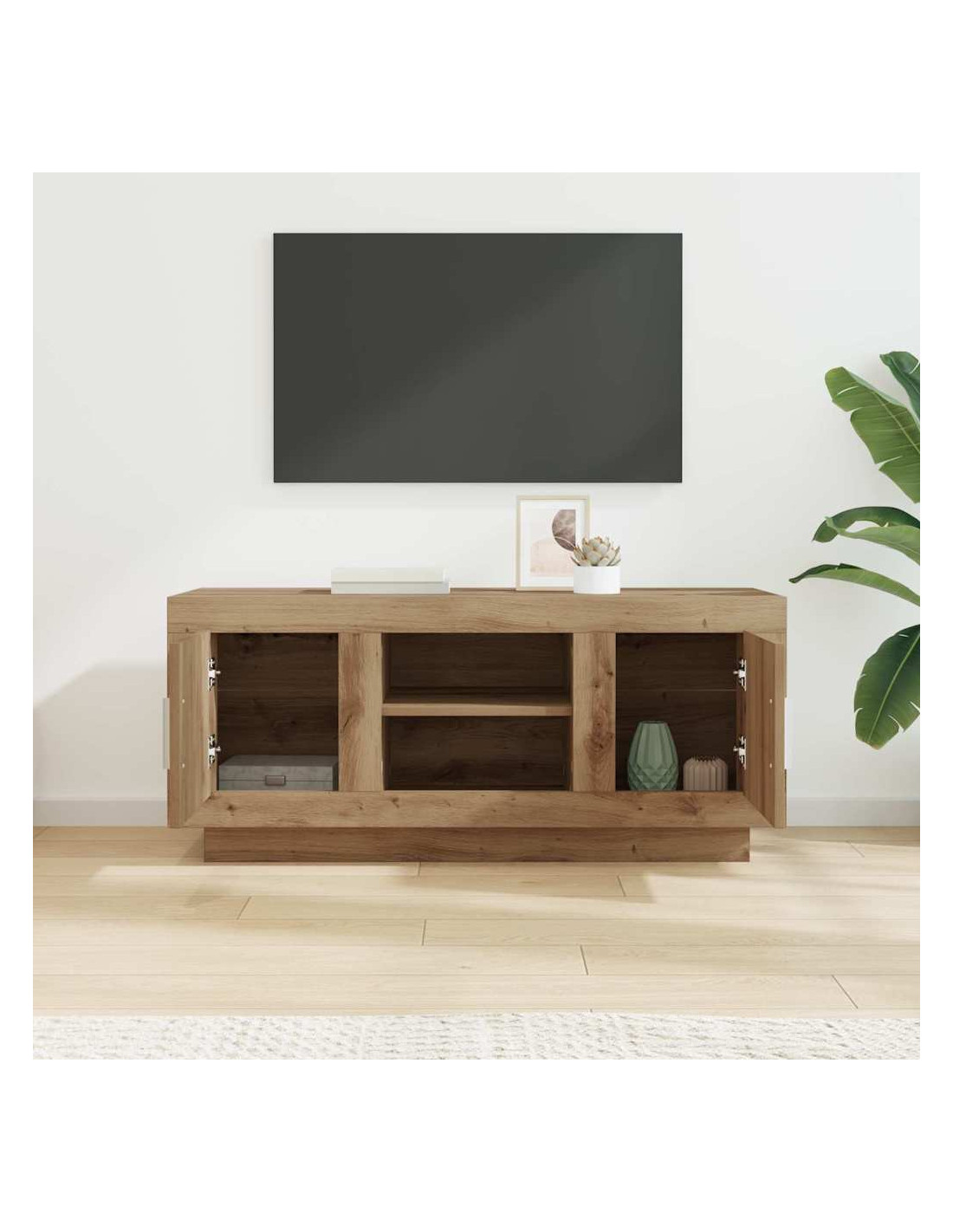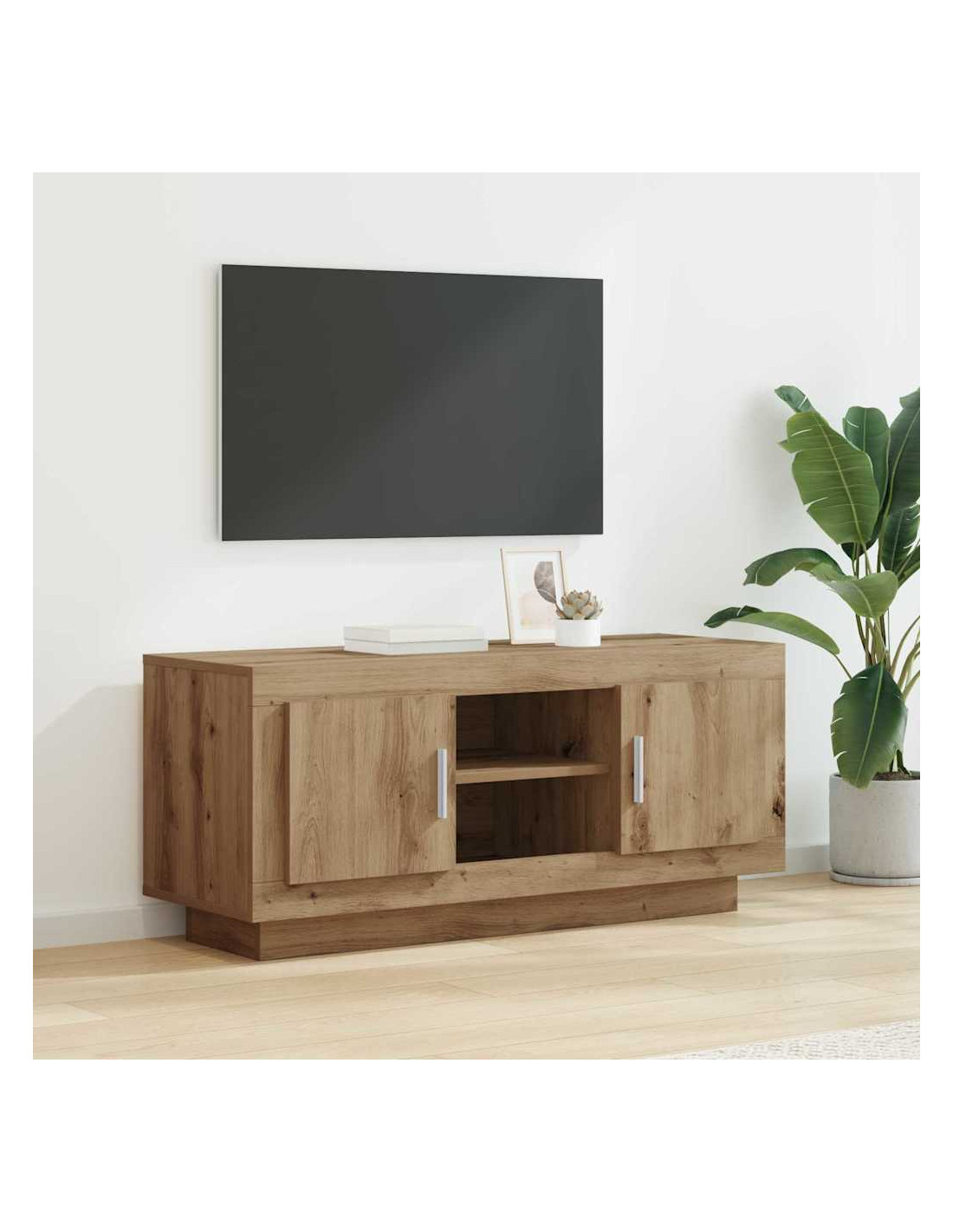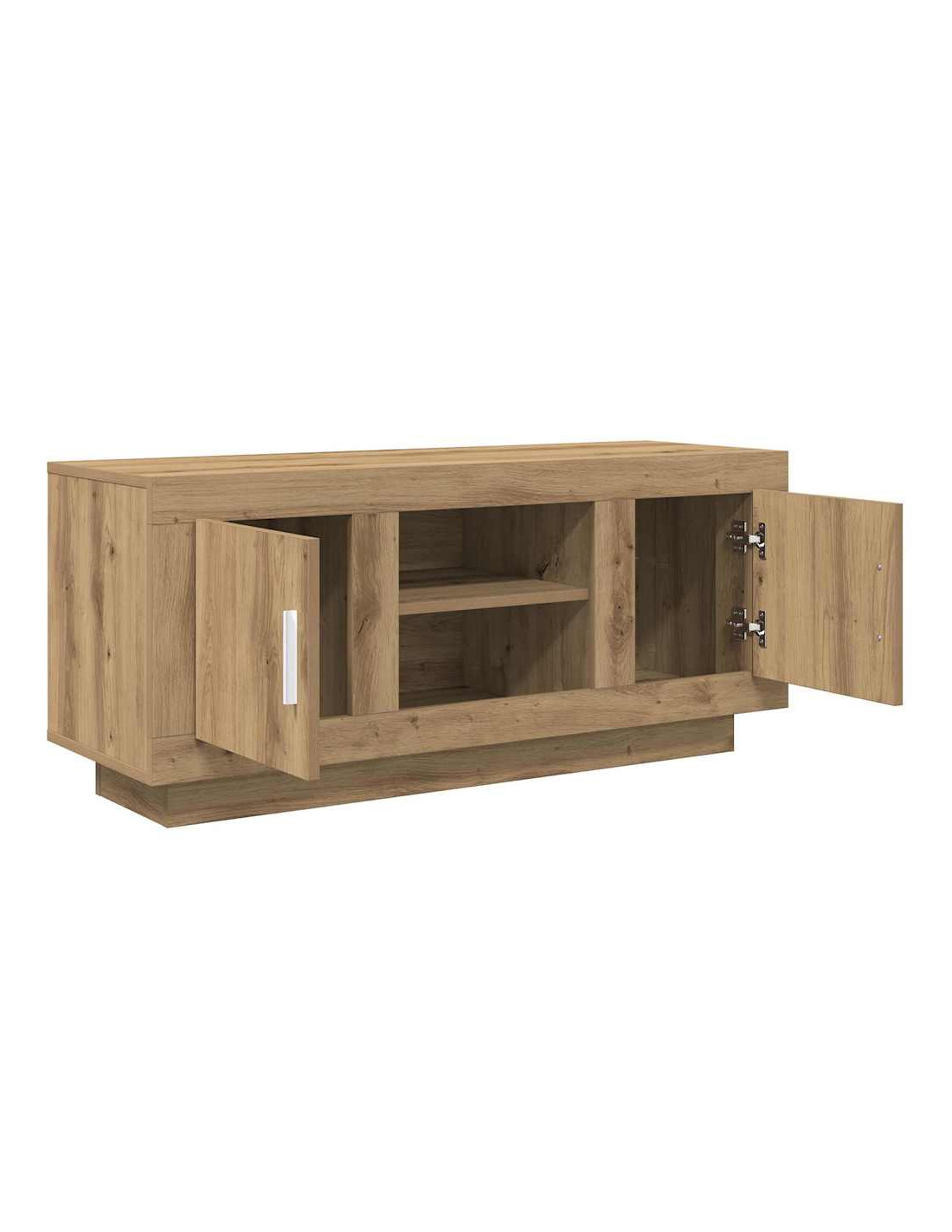 - Materiali: Questo mobile TV è fatto principalmente di legno ingegnerizzato, progettato per essere resistente e duraturo. È scelto per la sua uniformità, offrendo un aspetto coerente anche con l'uso quotidiano.