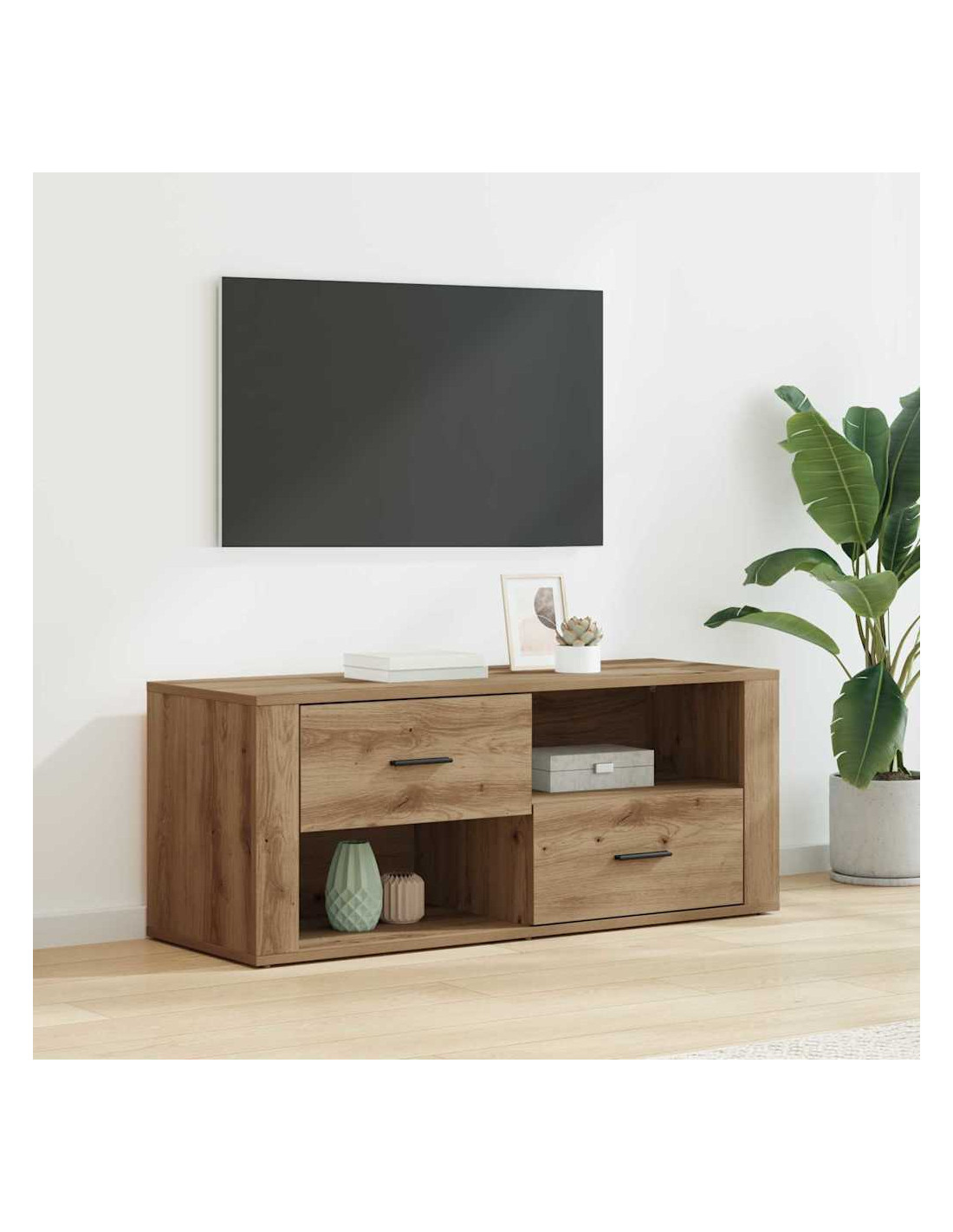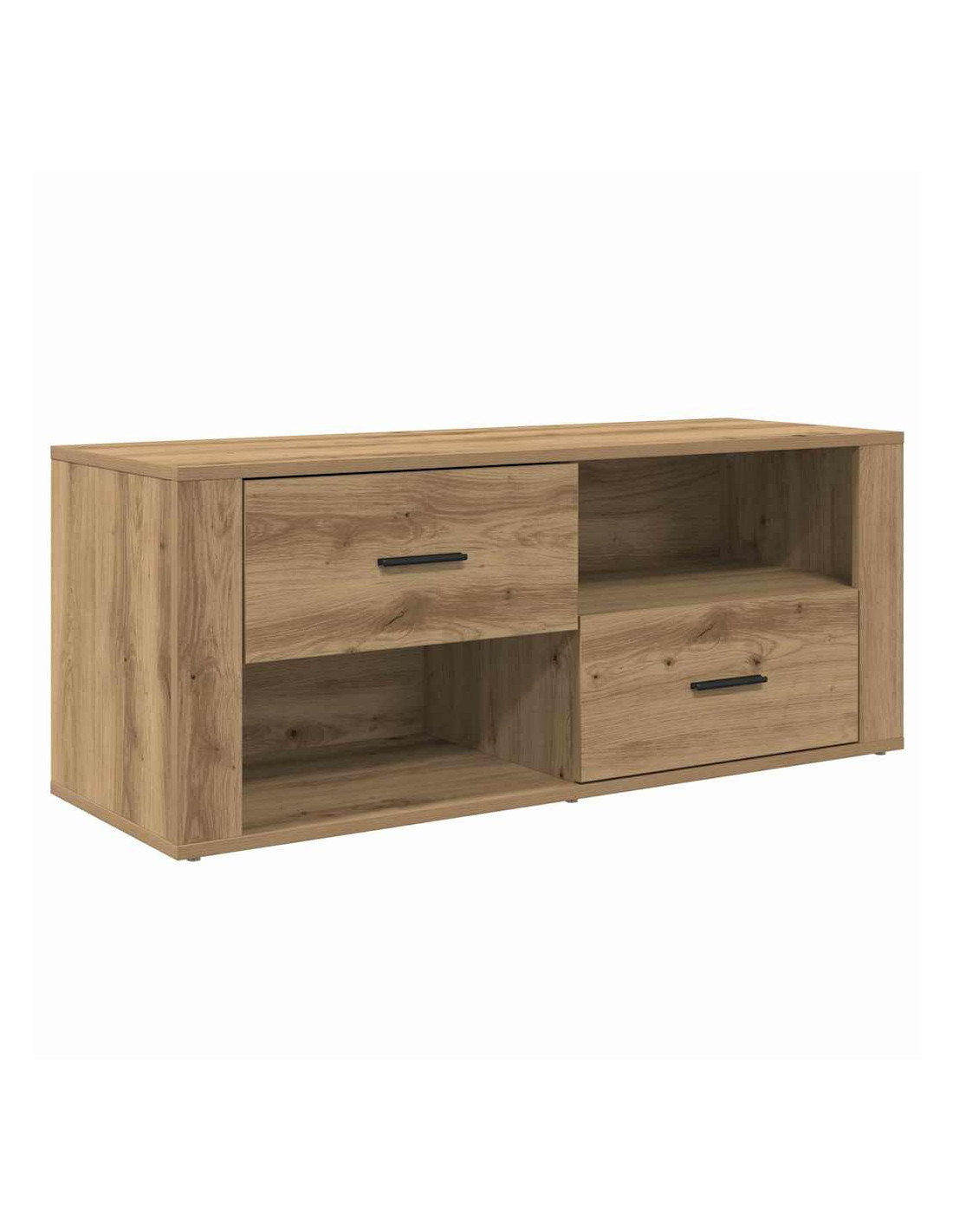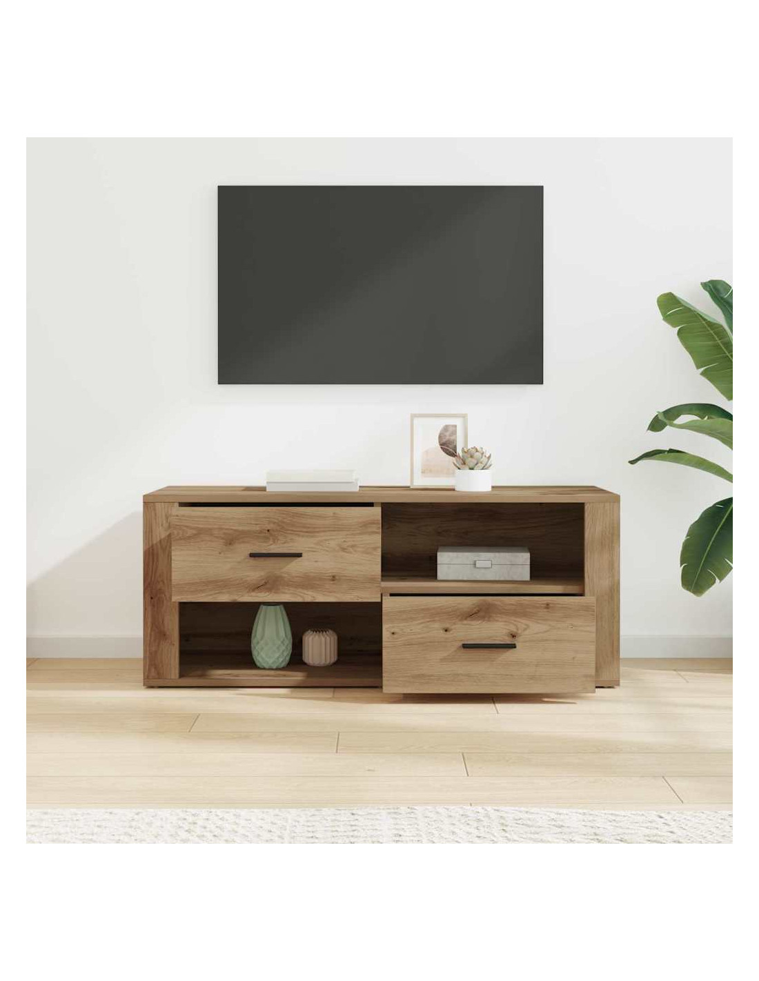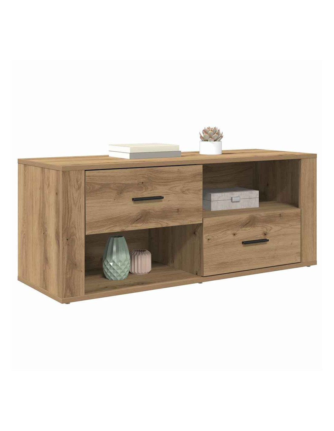 Questo mobile TV è un ottimo esempio di arredamento rustico che unisce stile e funzionalità. Costruito in legno ingegnerizzato, ha un design rettangolare ideale per il soggiorno moderno. Le texture ben curate e l'aspetto robusto completano qualsiasi ambiente rustico. Progettato in modo intelligente, offre tanto spazio per riporre oggetti, mantenendo una forma efficiente, perfetta per decorazioni e configurazioni multimediali.
