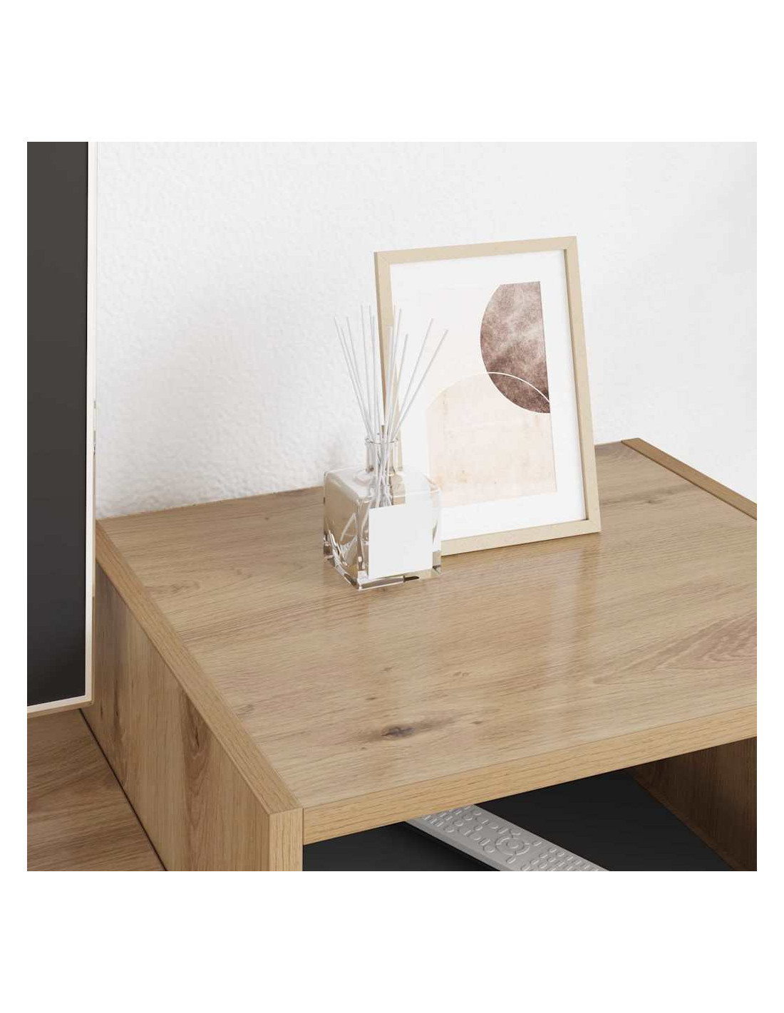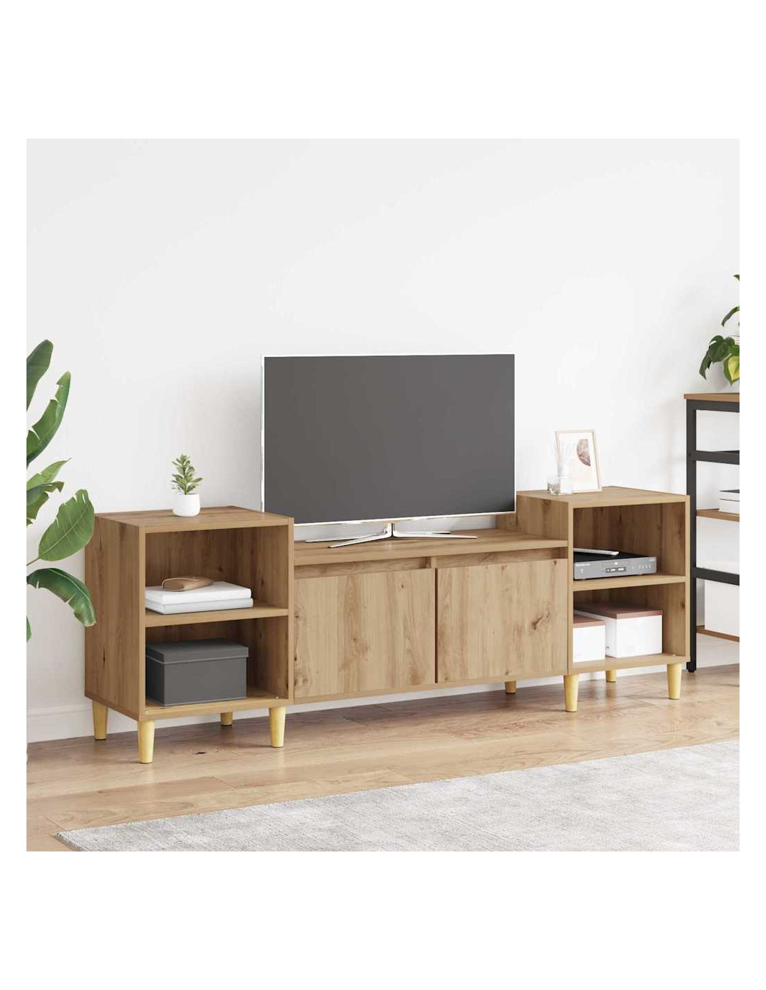 - Materiali: Fatto di legno ingegnerizzato robusto, questo mobile TV è sia resistente che affidabile. Il legno ingegnerizzato è scelto per la sua forza e per il suo aspetto, assicurando una struttura che resiste all'uso quotidiano mantenendo una bella finitura. La resilienza di questo materiale contribuisce alla durabilità del mobile, facendolo diventare un elemento che durerà nel tuo spazio.