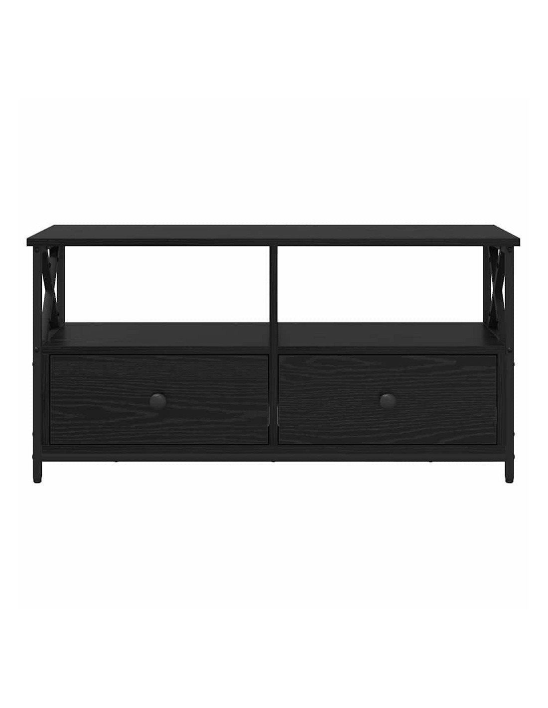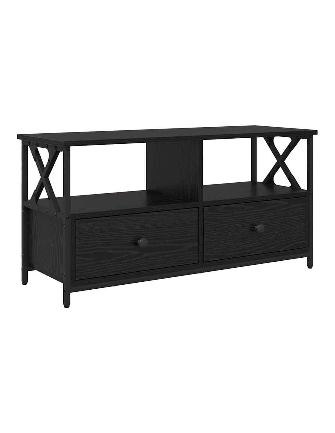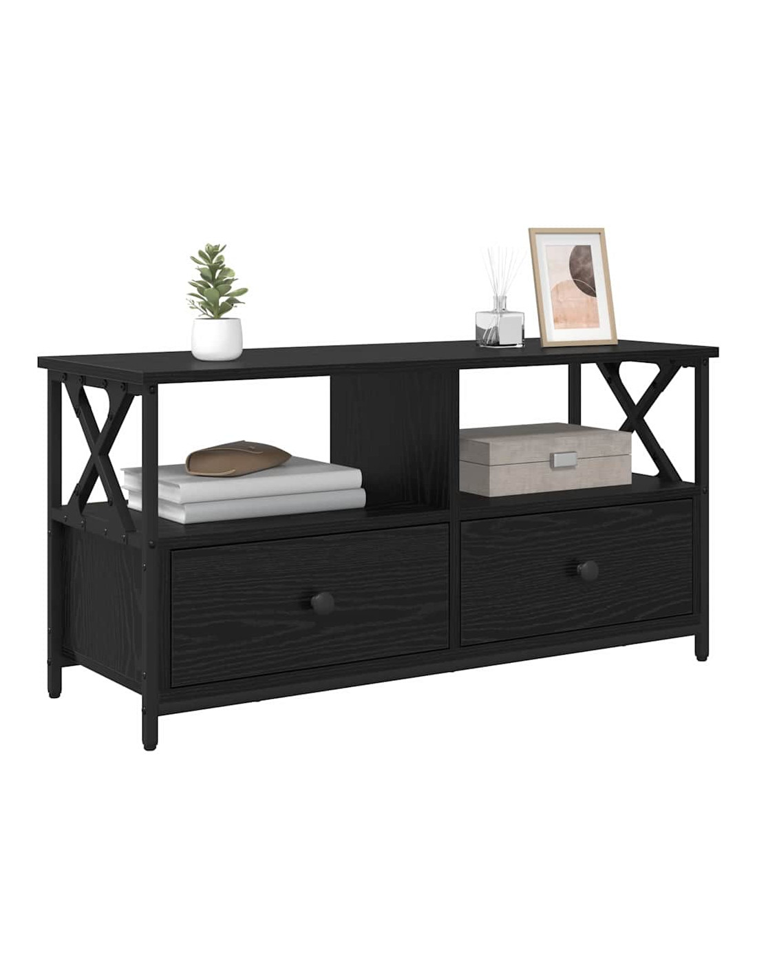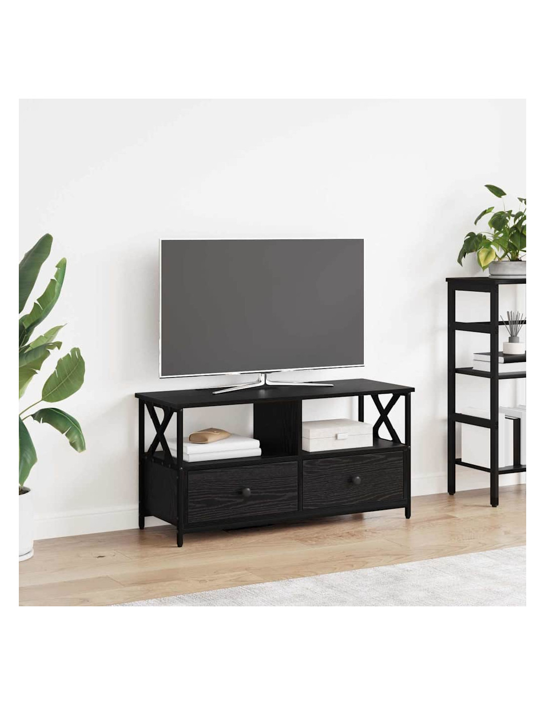- Componenti Inclusi: Ha un'organizzazione intelligente con ripiani e cassetti, tutti in legno ingegnerizzato. Questi sono pensati per una conservazione facile, permettendo di sistemare media, libri o oggetti decorativi. Ogni cassetto ha guide a sfera per un'apertura ottimale.