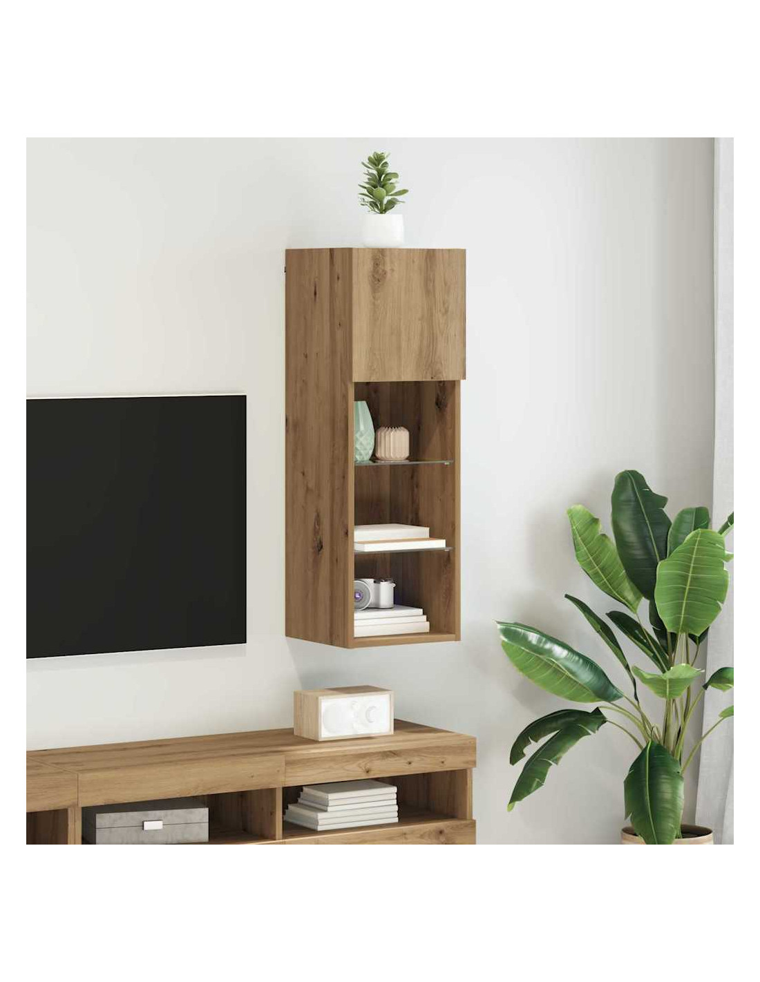 - Ripiani Pratici: Gli scaffali in legno ingegnerizzato offrono soluzioni di stoccaggio aperto. Ogni ripiano è funzionale, ospitando tutto, da dispositivi multimediali a elementi decorativi, massimizzando lo spazio senza sacrificare lo stile.