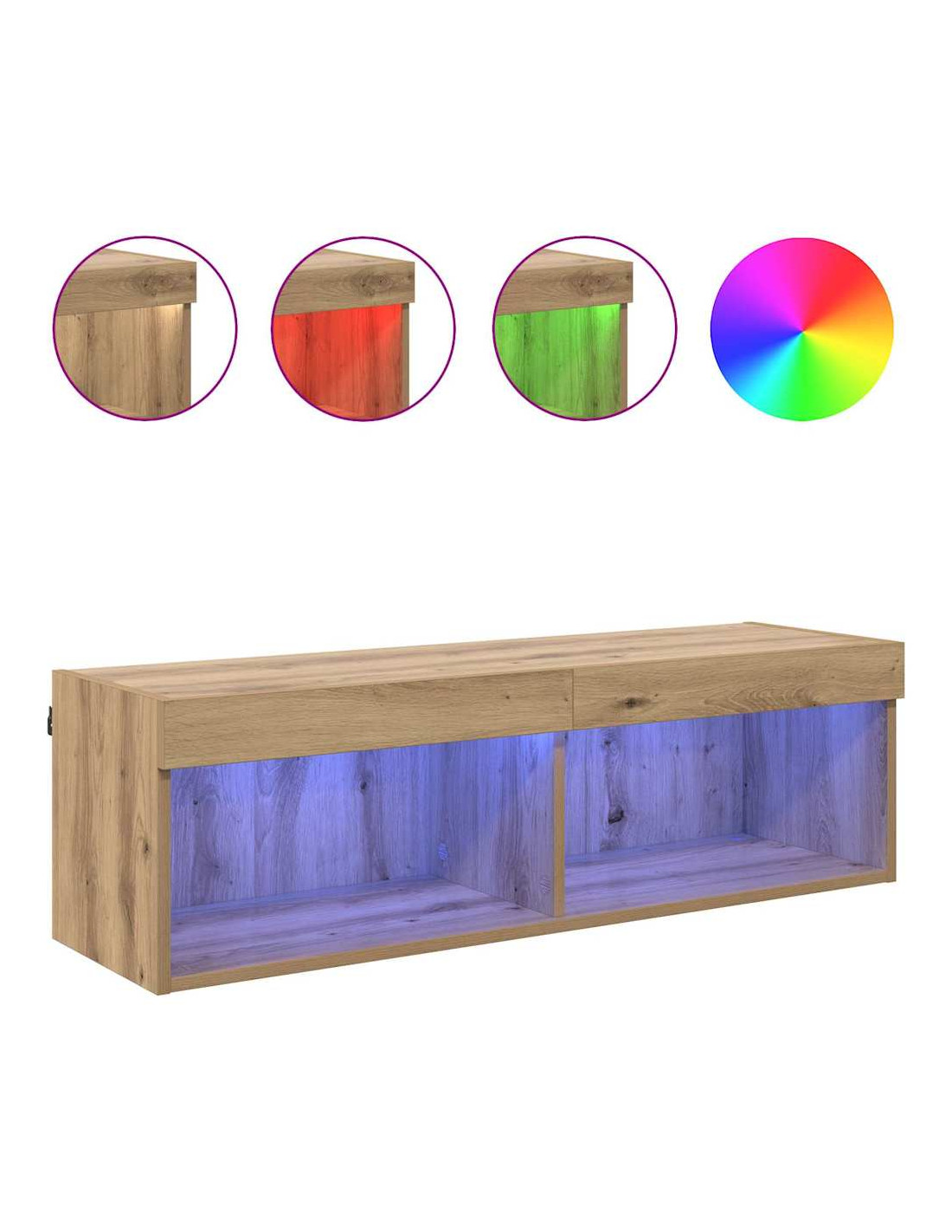 Questo set di mobile TV a LED da parete aggiunge un tocco di classe e funzionalità a qualsiasi soggiorno. Con il suo design elegante e la costruzione in legno ingegnerizzato, si inserisce perfettamente negli spazi moderni. Perfetto per chi ama unire bellezza e praticità, questo mobile TV ha un aspetto minimale e offre molto spazio per riporre e illuminare. Installato a parete, rende l'ambiente più arioso e dona un'atmosfera chic.