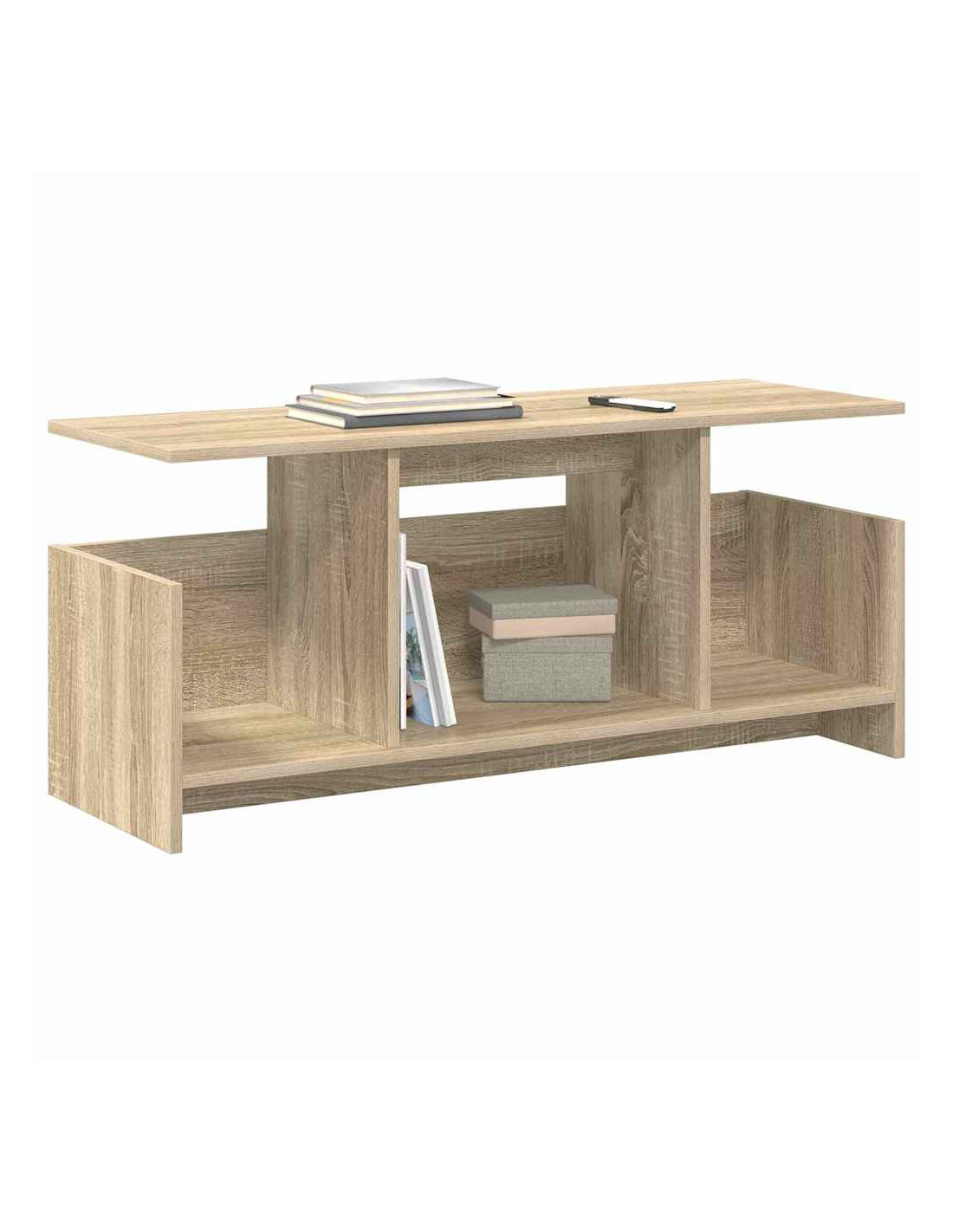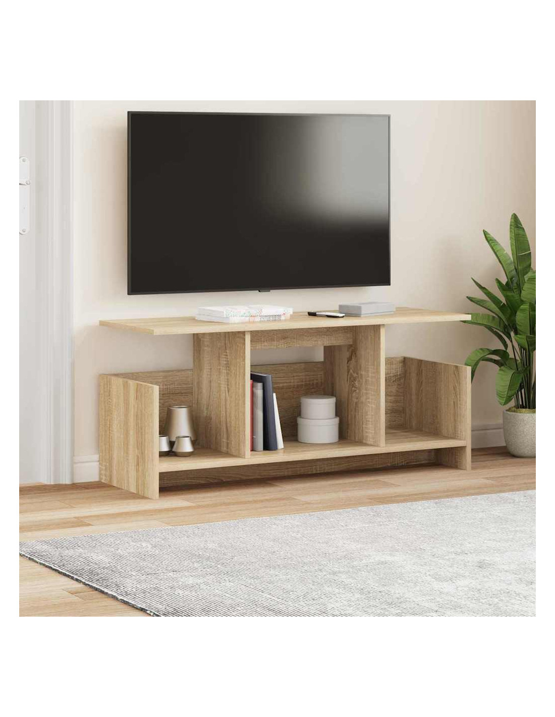 Questo supporto TV moderno, realizzato con legno ingegnerizzato, porta un tocco di classe in ogni soggiorno. Il design snello, con linee semplici e funzionali, si integra perfettamente con l'arredamento contemporaneo, offrendo una soluzione pratica per organizzare gli accessori per i media.