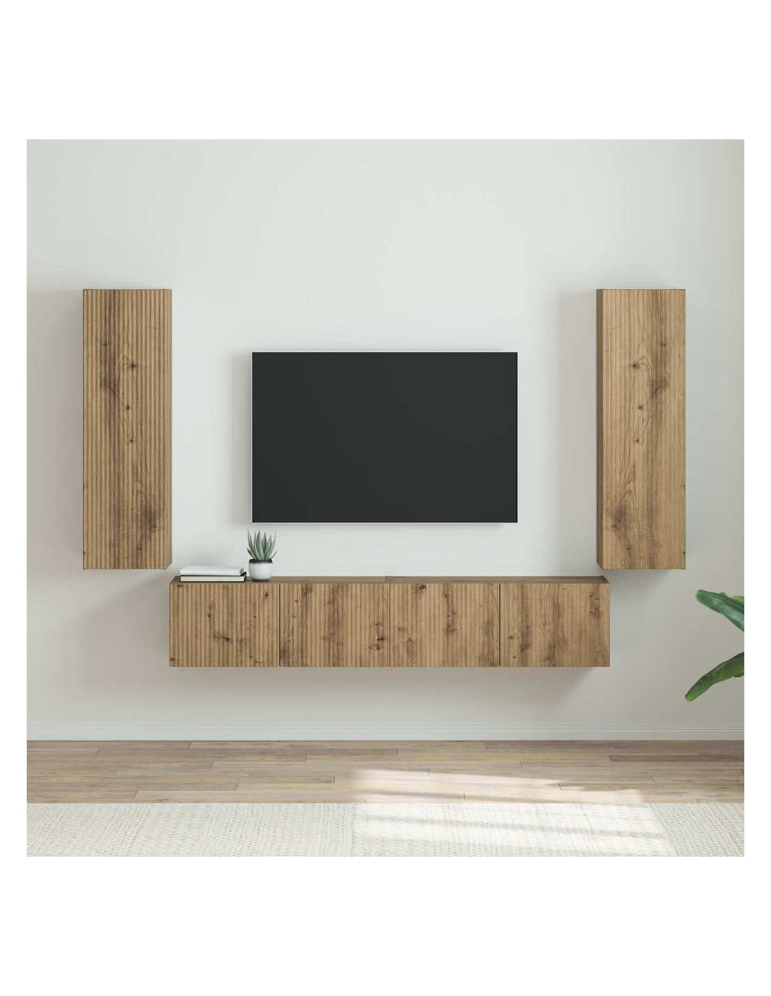 - Costruzione in legno ingegnerizzato: Fatto con legno ingegnerizzato di alta qualità, questo mobile a parete è robusto e affidabile. Il materiale è resistente all'usura, perfetto per mantenere un aspetto sempre attraente. Il suo schema di venature aggiunge eleganza, migliorando l'aspetto del tuo soggiorno.