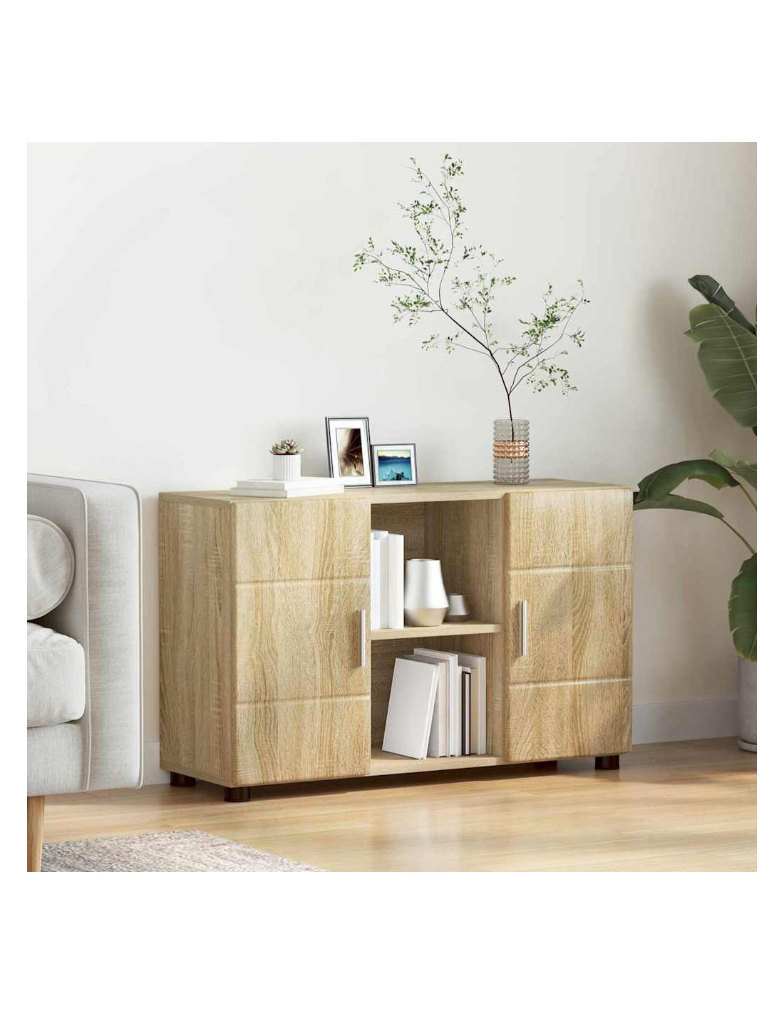 - Legno ingegnerizzato di qualità: Questo mobile è fatto con legno ingegnerizzato, scelto per la sua forza e stabilità. È resistente e durevole, progettato per affrontare l'uso quotidiano. La superficie liscia mette in risalto il design semplice, perfetto per stili moderni.