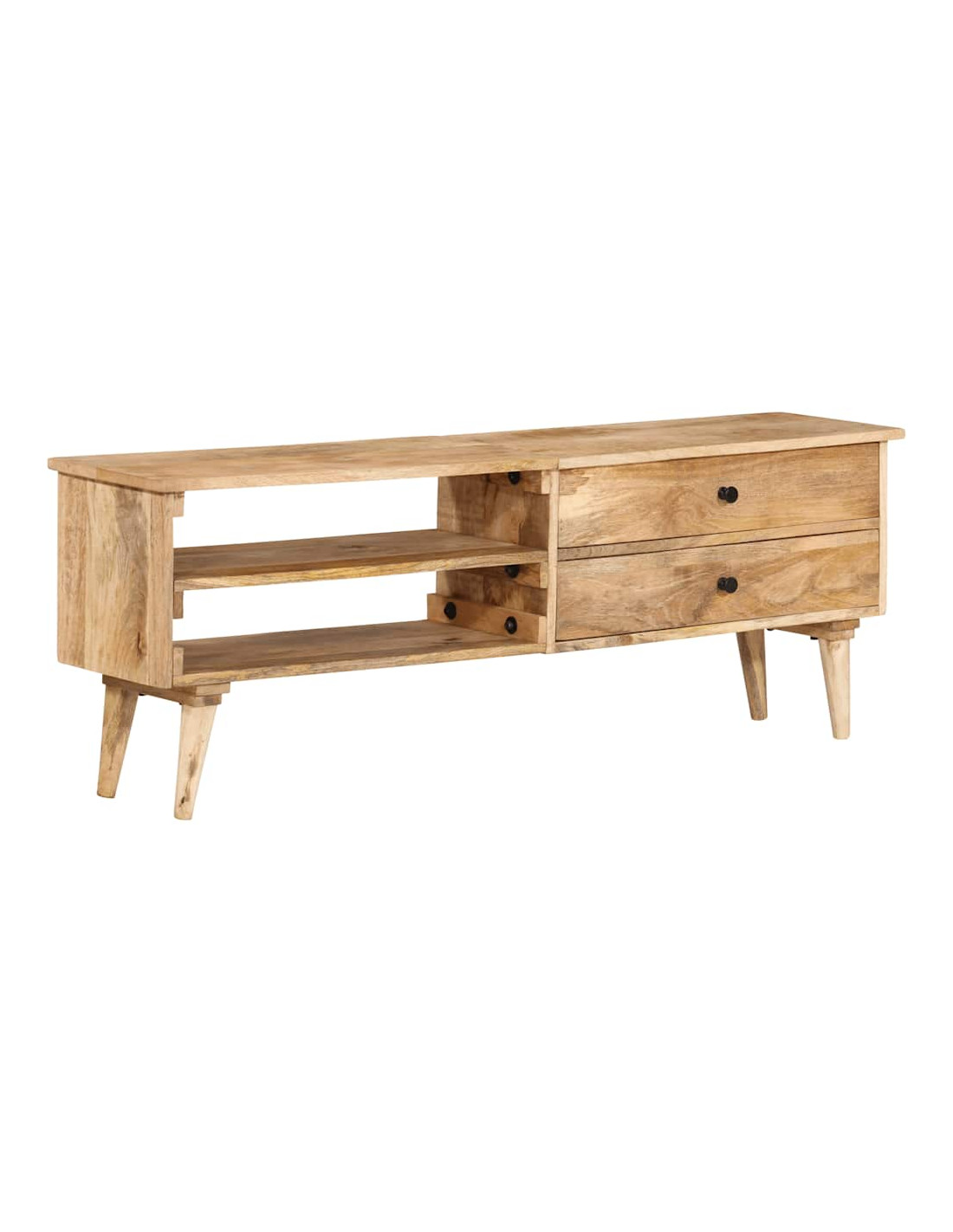 Questo mobile porta TV è realizzato in legno massello di mango, un legno duro tropicale abbastanza resistente da sopportare grossi pesi e l'usura del tempo. In particolare, la squisita fattura e le belle venature del legno rendono ogni pezzo leggermente diverso da tutti gli altri. Questa credenza bassa è dotata di 2 cassetti e 2 vani aperti, che offrono ampio spazio dove riporre i vostri DVD, apparecchi multimediali, libri e piccoli oggetti essenziali tenendoli ben organizzati e a portata di mano.