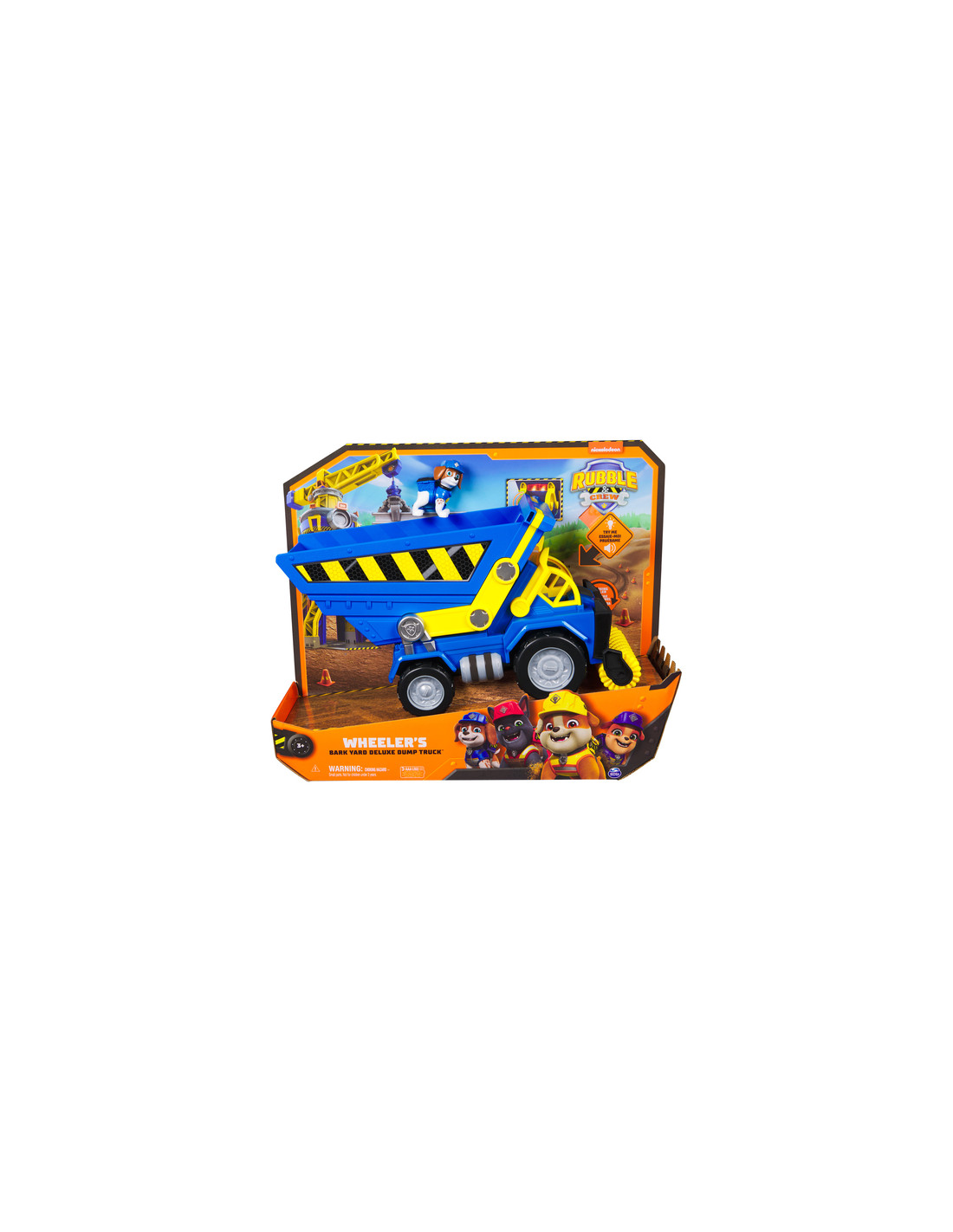 Amplia il tuo universo PAW Patrol con Wheeler, il tuo cucciolo preferito Rubble & Crew, e il suo gigante veicolo ribaltabile. Questo giocattolo da cantiere gigante è dotato di ruote funzionanti, attrezzi giocattolo articolati, luci ed effetti sonori. Questo set con personaggio e veicolo giocattolo include un'action figure di Wheeler alta 5 cm, con la sua uniforme ufficiale Rubble & Crew. Quando è il momento di entrare in azione, aggancia Wheeler al posto di guida e premi verso il basso per attivare le luci e gli effetti sonori emozionanti della serie. Riempi il camion ribaltabile con i materiali e solleva il pianale per scaricare il contenuto, poi appiattisci il terreno utilizzando il rullo compattatore, proprio come fa Wheeler nel cartone. Per altri modi divertenti di giocare, cerca tutti i camion giocattolo da cantiere Rubble & Crew, i peluche, i personaggi giocattolo e i set di gioco con sabbia Kinetic Build-It, oltre ai set di gioco per ampliare il tuo universo di gioco di fantasia a tema operaio (ciascuno in vendita separatamente). Se cerchi giocattoli per bambini in età prescolare di 2-4 anni, i giocattoli Rubble & Crew per bambini dai 3 anni in su sono imperdibili. Ricrea le emozioni della serie Rubble & Crew.