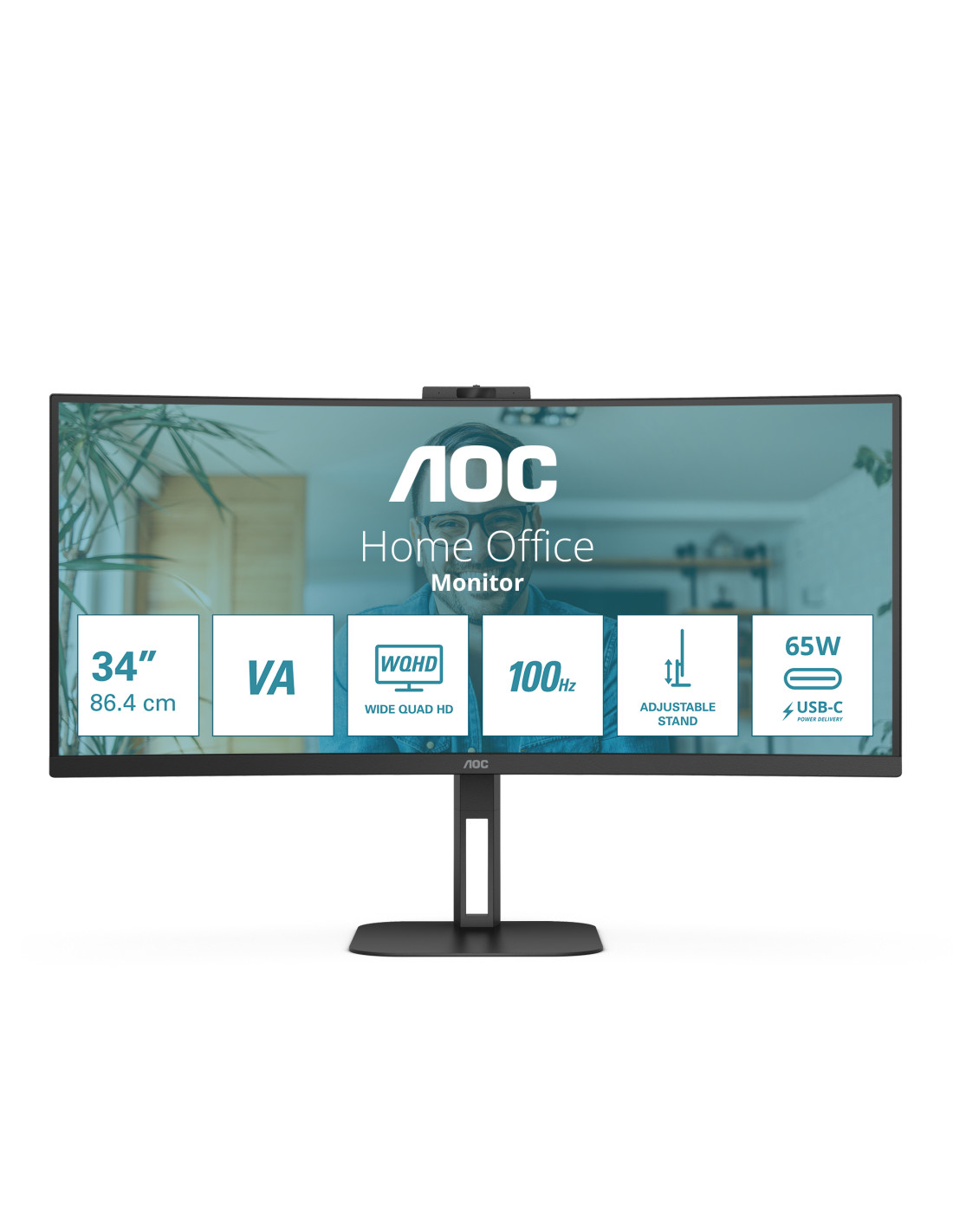AOC CU34V5CW è un monitor curvo senza cornice su tre lati dotato di un pannello VA da 34" con risoluzione QHD UltraWide 21:9 per un'esperienza visiva coinvolgente e suggestiva, in grado di supportare qualsiasi lavoro complesso con la funzione Picture by Picture MultiView. Offre un'ampia gamma di opzioni di connettività grazie a USB-C con Power Delivery fino a 65W, 4 porte USB e HDMI. Accesso facile e sicuro con la webcam integrata per Windows Hello.