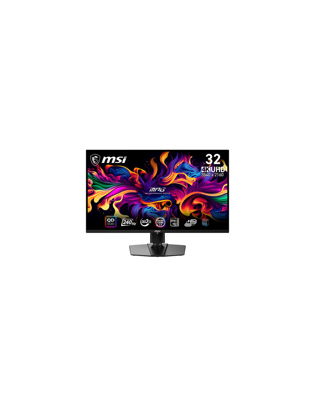 MSI MPG 321URX QD-OLED. Dimensioni diagonale schermo: 80 cm (31.5"), Risoluzione del display: 3840 x 2160 Pixel, Tipologia HD: 4K Ultra HD, Tecnologia display: QD-OLED, Tempo di risposta: 1 ms, Rapporto d'aspetto nativo: 16:9, Angolo di visualizzazione (orizzontale): 178°, Angolo di visualizzazione (verticale): 178°. Hub USB integrato. Montaggio standard VESA, Regolazione altezza. Colore del prodotto: Nero