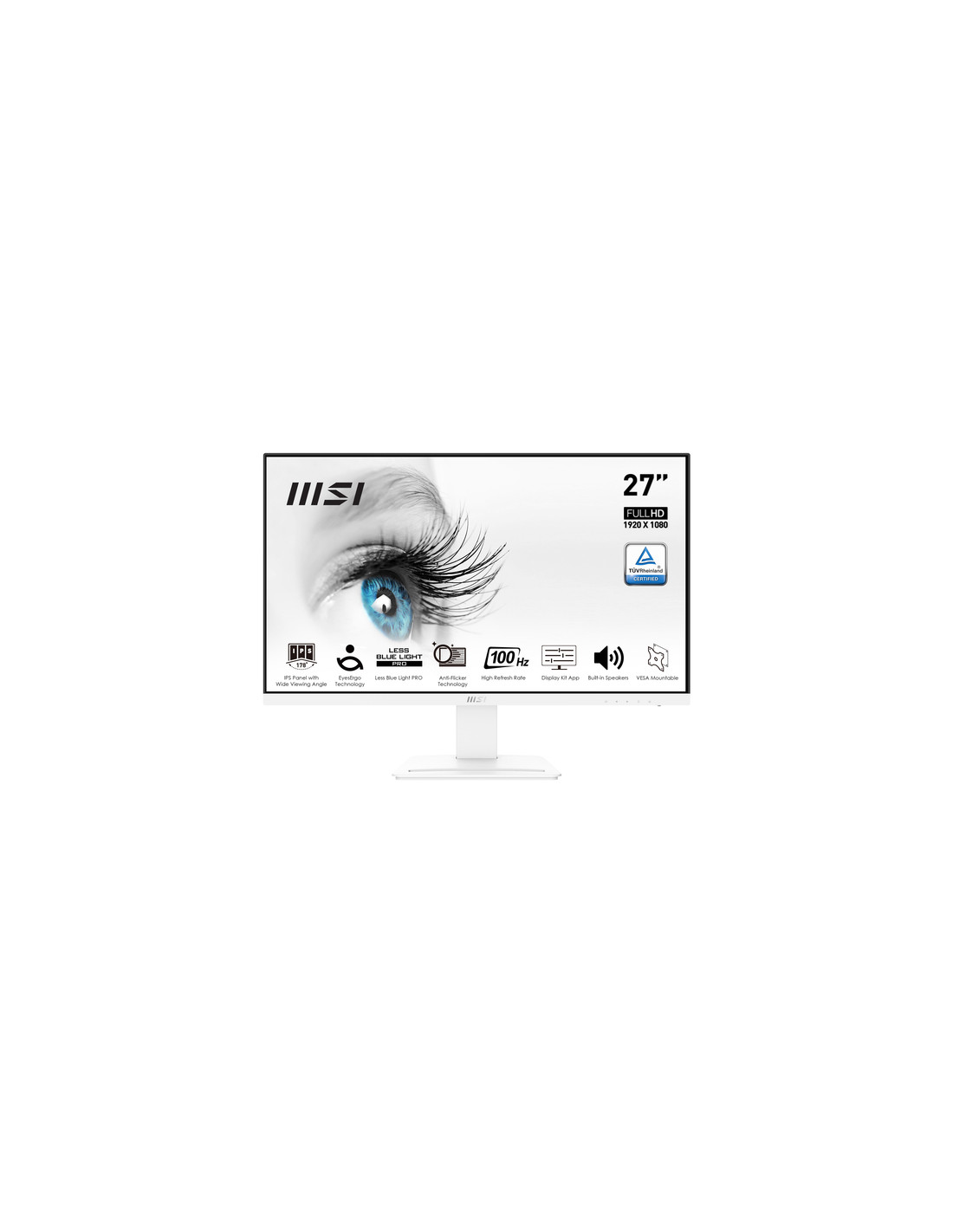 MSI Pro MP273AW. Dimensioni diagonale schermo: 68,6 cm (27"), Risoluzione del display: 1920 x 1080 Pixel, Tipologia HD: Full HD, Tecnologia display: LED, Tempo di risposta: 4 ms, Rapporto d'aspetto nativo: 16:9, Angolo di visualizzazione (orizzontale): 178°, Angolo di visualizzazione (verticale): 178°. Altoparlanti incorporati. Montaggio standard VESA. Colore del prodotto: Bianco