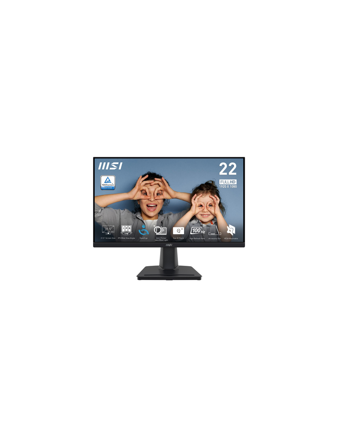MSI PRO MP225. Dimensioni diagonale schermo: 54,6 cm (21.5"), Risoluzione del display: 1920 x 1080 Pixel, Tipologia HD: Full HD, Tecnologia display: LED, Tempo di risposta: 4 ms, Rapporto d'aspetto nativo: 16:9, Angolo di visualizzazione (orizzontale): 178°, Angolo di visualizzazione (verticale): 178°. Altoparlanti incorporati. Montaggio standard VESA. Colore del prodotto: Nero