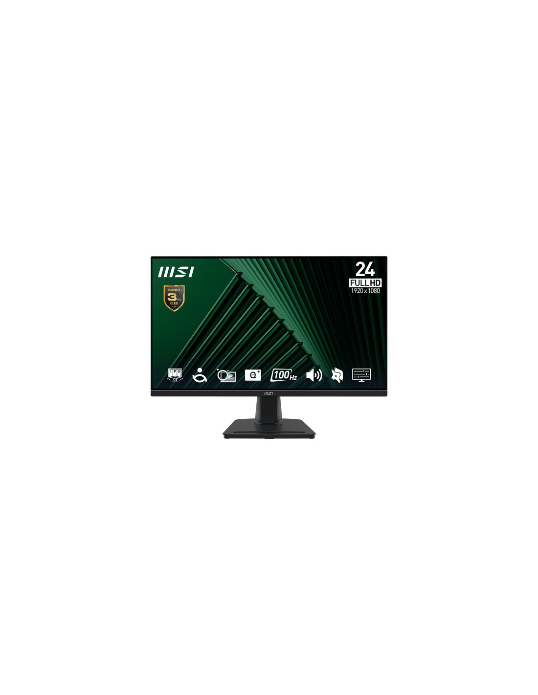 MSI Pro MP245G. Dimensioni diagonale schermo: 60,5 cm (23.8"), Risoluzione del display: 1920 x 1080 Pixel, Tipologia HD: Full HD, Tecnologia display: LCD, Tempo di risposta: 4 ms, Rapporto d'aspetto nativo: 16:9, Angolo di visualizzazione (orizzontale): 178°, Angolo di visualizzazione (verticale): 178°. Altoparlanti incorporati. Montaggio standard VESA. Colore del prodotto: Nero