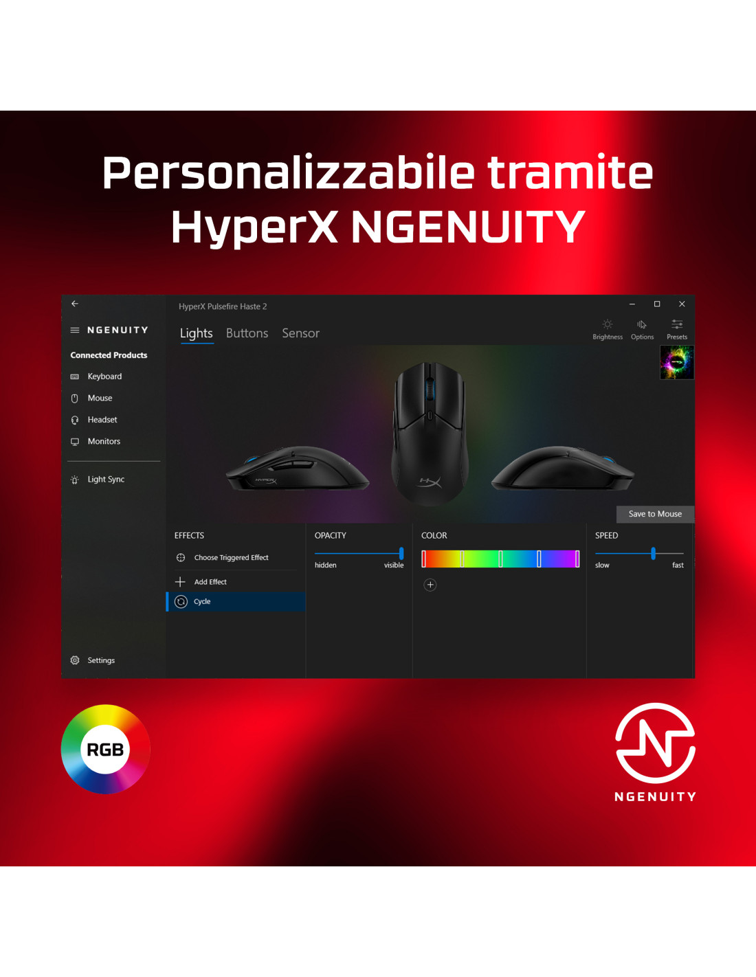 HyperX Pulsefire Haste 2 è progettato per chi vuole sfruttare al massimo ogni millisecondo. I nostri designer hanno ottimizzato il modello Pulsefire Haste originale per offrire una versione con guscio robusto dalle prestazioni eccezionali, per un peso di appena 53 g3. Il nostro team ha realizzato una suite di componenti HyperX ad alte prestazioni: tra questi spicca il sensore HyperX 26K di precisione con una risoluzione DPI nativa fino a 26.000 e una velocità di rilevamento fino a 650 IPS. Pulsefire Haste 2 offre tasti HyperX personalizzati che forniscono un ottimo feedback tattile e udibile a ogni clic e assicurano una durata fino a 100 milioni di clic. Sfrutta una maggiore reattività e precisione con la frequenza di polling di 8000 Hz2 di Pulsefire Haste 2. Potrai contare anche su un controllo fisico del mouse di livello superiore con l'impugnatura antiscivolo inclusa, un cavo paracord super flessibile e pattini a basso attrito. Sfrutta al massimo ogni movimento del mouse con il software HyperX NGENUITY e crea macro per i 6 pulsanti programmabili, personalizza le impostazioni DPI e regola l'illuminazione RGB.
