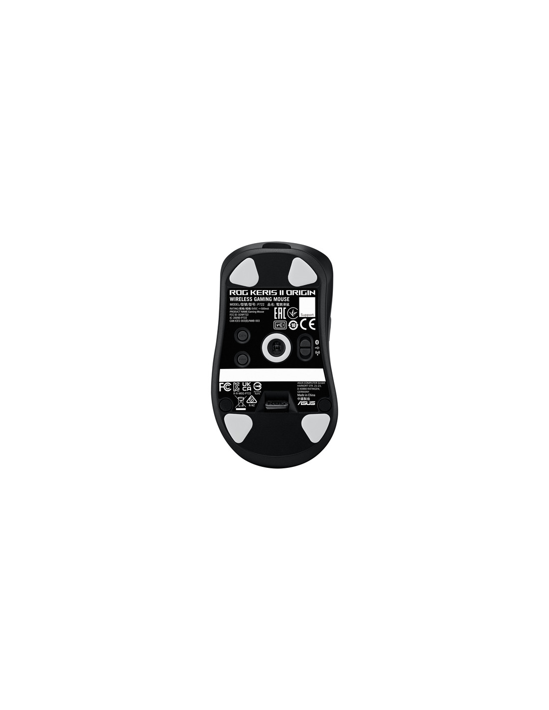 ASUS ROG Keris II Origin BLK. Fattore di forma: Mano destra. Tecnologia di rilevamento del movimento: Ottico, Interfaccia dispositivo: RF Wireless + Bluetooth + USB Type-A, Risoluzione movimento: 42000 DPI, Tipo di pulsanti: Tasti premuti, Numero di tasti: 6, Tipo di scorimmento: Rotella. colore d'illuminazione: Multi. Alimentazione: Batterie/Cavo. Colore del prodotto: Nero