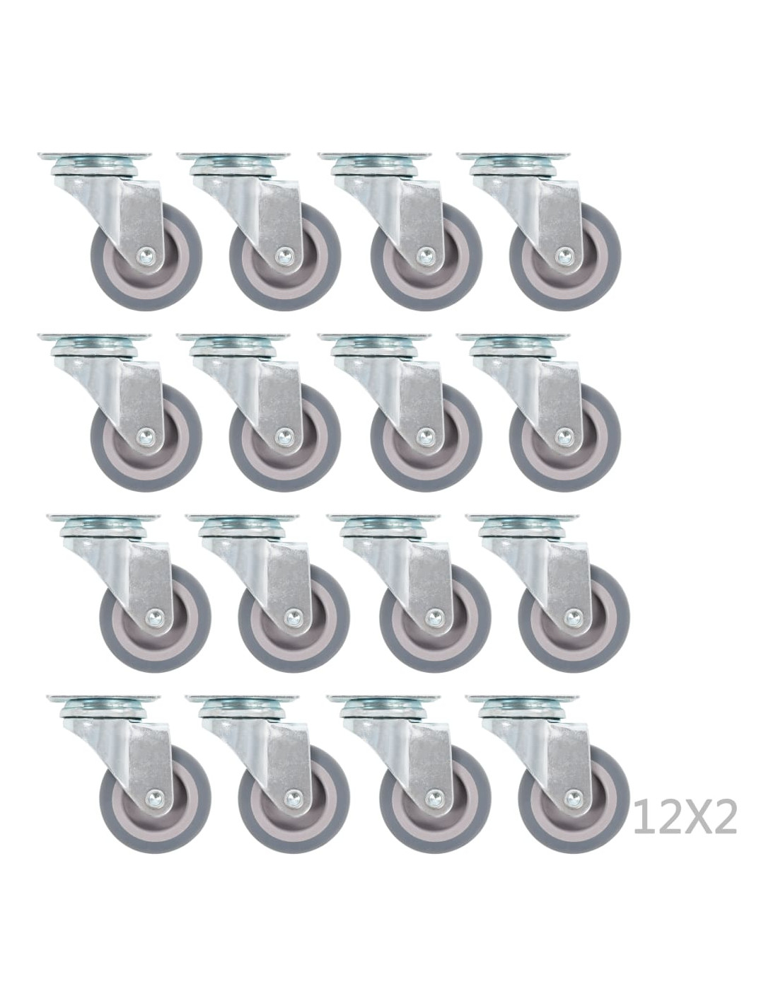 Questo set, composto da 72 rotelle girevoli, costituisce l'accessorio perfetto per attrezzature e mobili di piccole dimensioni come banchi da lavoro, carrelli, tavolini da caffè, piantane, scaffali, carrelli della spesa, etc. Le ruote sono realizzate in TPR (gomma termoplastica), un materiale caratterizzato da un'ottima resistenza agli urti e alle vibrazioni e che consente alle ruote di girare in modo fluido e silenzioso. La loro superficie morbida, inoltre, protegge efficacemente il pavimento dai graffi. La struttura in ferro zincato è altamente resistente alla ruggine e fornisce una maggiore robustezza e durata alle ruote. Ogni ruota possiede una capacità di carico massima di 35 kg. La consegna include 72 ruote girevoli.