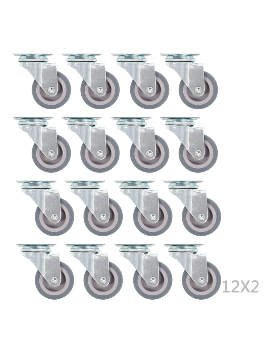 Questo set, composto da 96 rotelle girevoli, costituisce l'accessorio perfetto per attrezzature e mobili di piccole dimensioni come banchi da lavoro, carrelli, tavolini da caffè, piantane, scaffali, carrelli della spesa, etc. Le ruote sono realizzate in TPR (gomma termoplastica), un materiale caratterizzato da un'ottima resistenza agli urti e alle vibrazioni e che consente alle ruote di girare in modo fluido e silenzioso. La loro superficie morbida, inoltre, protegge efficacemente il pavimento dai graffi. La struttura in ferro zincato è altamente resistente alla ruggine e fornisce una maggiore robustezza e durata alle ruote. Ogni ruota possiede una capacità di carico massima di 35 kg. La consegna include 96 ruote girevoli.