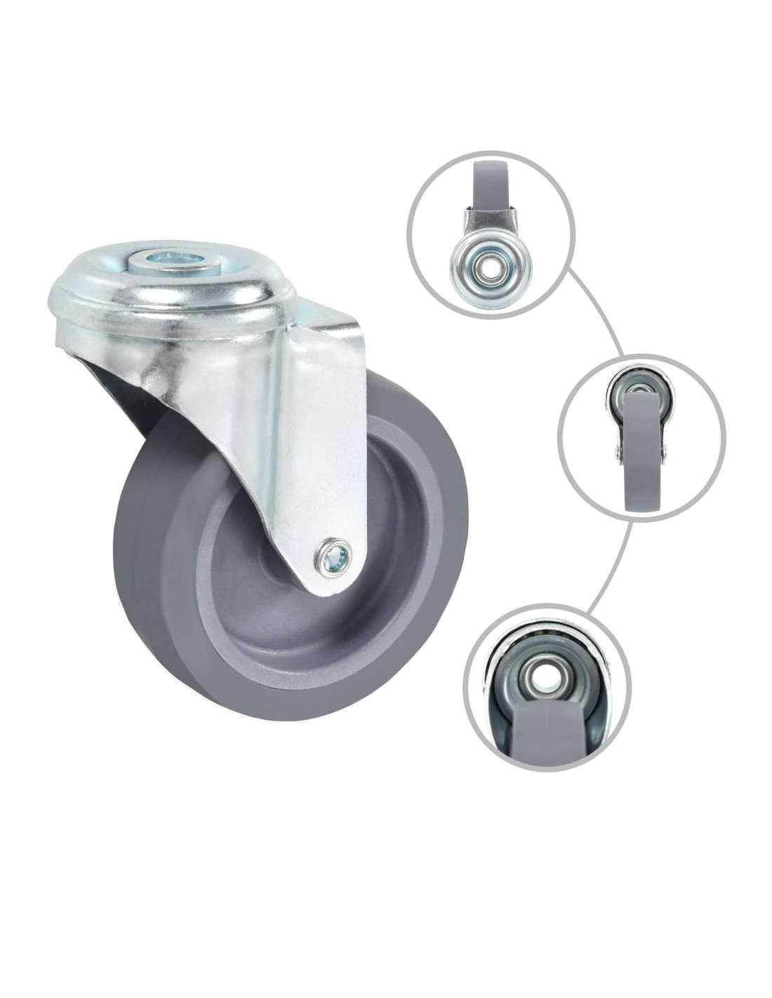 Questo set, composto da 16 rotelle girevoli con foro per bulloni, costituisce l'accessorio perfetto per attrezzature e mobili di piccole dimensioni come banchi da lavoro, carrelli, tavolini da caffè, piantane, scaffali, carrelli della spesa, etc. Le ruote sono realizzate in TPR (gomma termoplastica), un materiale caratterizzato da un'ottima resistenza agli urti e alle vibrazioni e che consente alle ruote di girare in modo fluido e silenzioso. La loro superficie morbida, inoltre, protegge efficacemente il pavimento dai graffi. La struttura in ferro zincato è altamente resistente alla ruggine e fornisce una maggiore robustezza e durata alle ruote. Ogni ruota possiede una capacità di carico massima di 45 kg. La consegna include 16 ruote girevoli con foro per bulloni.
