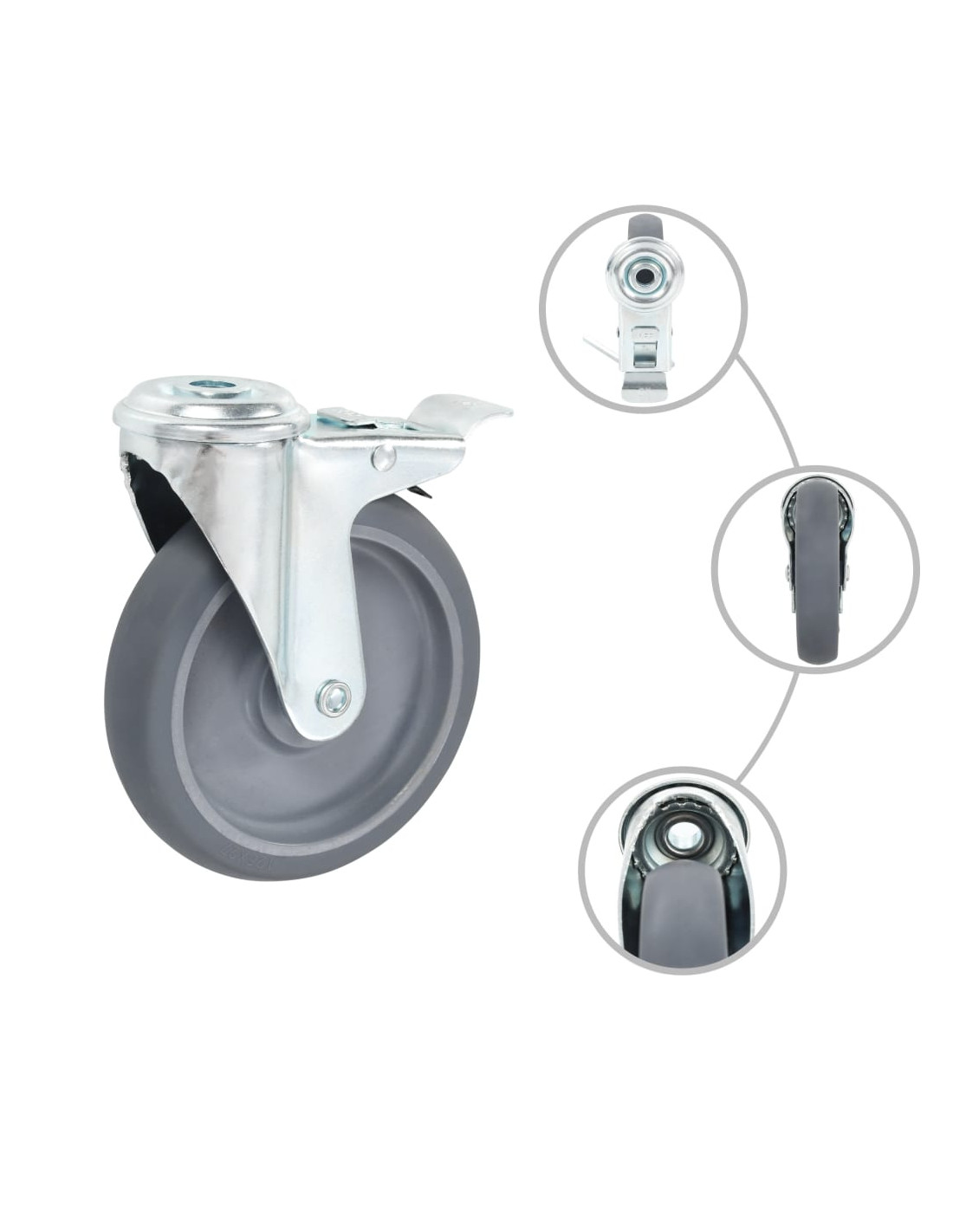 Questo set, composto da 32 rotelle girevoli con foro per bullone, costituisce l'accessorio perfetto per attrezzature e mobili di piccole dimensioni come banchi da lavoro, carrelli, tavolini da caffè, piantane, scaffali, carrelli della spesa, etc. Le ruote sono realizzate in TPR (gomma termoplastica), un materiale che si distingue per una buona resistenza agli urti e alle vibrazioni e che consente alle ruote di girare in modo fluido e silenzioso. La loro superficie morbida, inoltre, protegge efficacemente il pavimento dai graffi. La struttura in ferro zincato è altamente resistente alla ruggine e garantisce maggiore robustezza e durata delle ruote. Metà delle ruote girevoli sono dotate di sistema frenante per garantire una maggiore flessibilità di utilizzo. Ogni ruota ha una capacità di carico massima pari a 80 kg. La consegna include 16 ruote girevoli con foro per bullone e 16 ruote girevoli con foro per bullone e freno.
