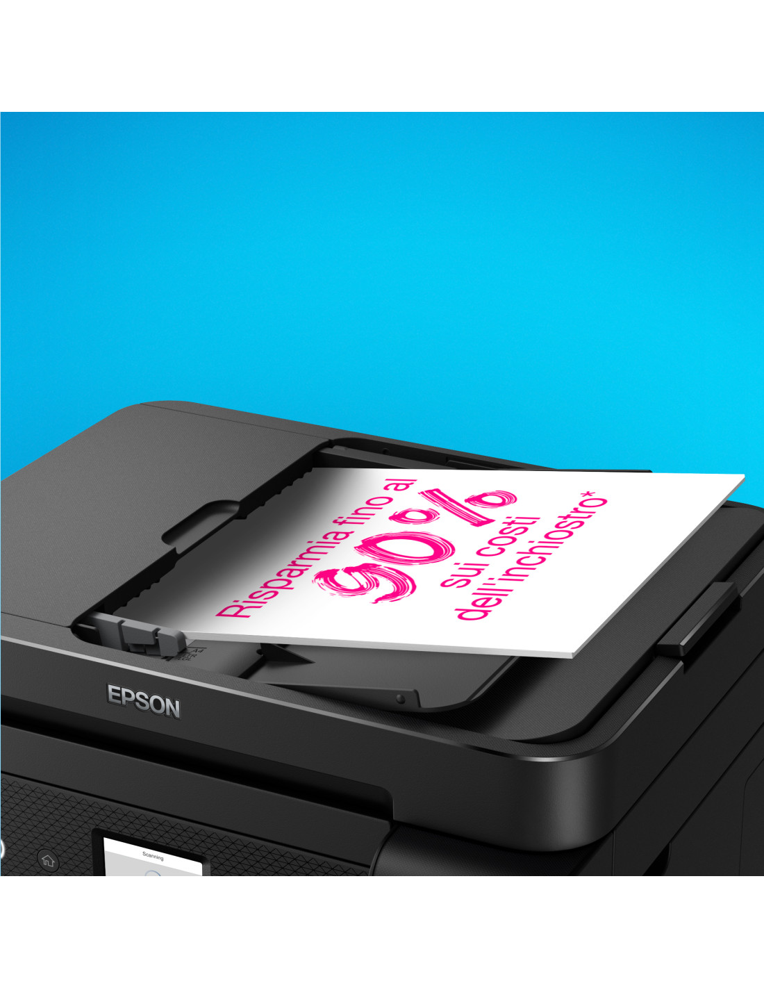 Questa stampante ultraconveniente ti consente di risparmiare fino al 90% sui costi di stampa1. Inoltre, la confezione include un quantitativo di inchiostro sufficiente per 3 anni2. Un unico set di flaconi di inchiostro consente di stampare fino a 4.500 pagine in bianco e nero e fino a 7.500 pagine a colori3, l'equivalente di un massimo di 72 cartucce di inchiostro.1