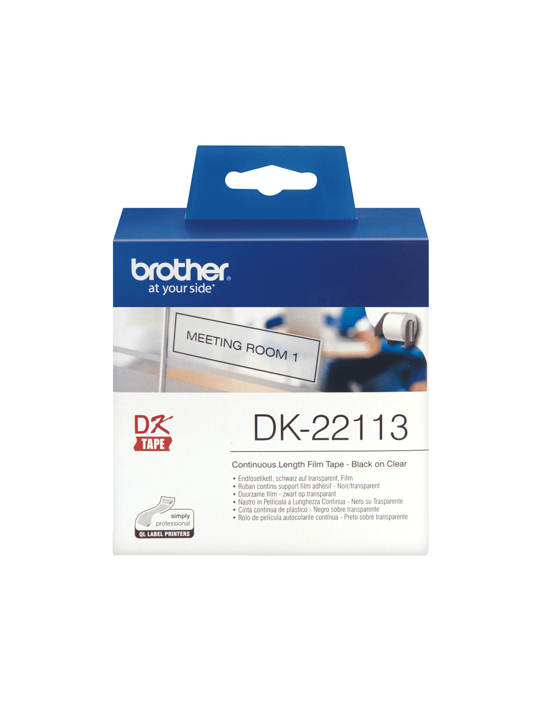 Queste etichette nero su trasparente originali Brother DK-22113 sono pratiche per tanti tipi di etichettatura, in varie forme e dimensioni. Adatto alla casa e all'ufficio, questo rotolo di etichette a lunghezza continua può riportare loghi, codici a barre, insegne su misura per aule, uffici o stanze.