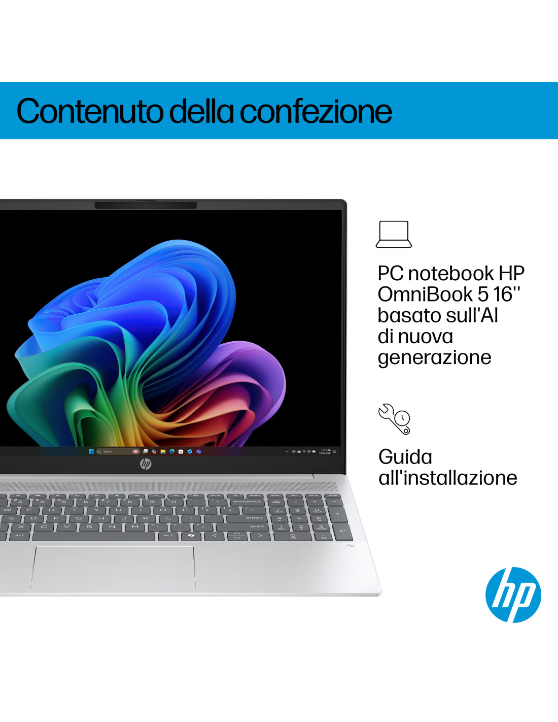 Semplifica la tua giornata con HP OmniBook 5, il PC laptop basato sull'AI, dotato di un processore AMD Ryzen™ AI serie 300[1] e fino a 50 TOPS per un multitasking continuo. Libera la creatività e porta il tuo gameplay a un livello superiore su un eccezionale display 2K[3], ricarica più rapidamente con HP Fast Charge[4], connettiti facilmente tramite USB-C e accedi istantaneamente all'AI con il tasto Copilot[5].