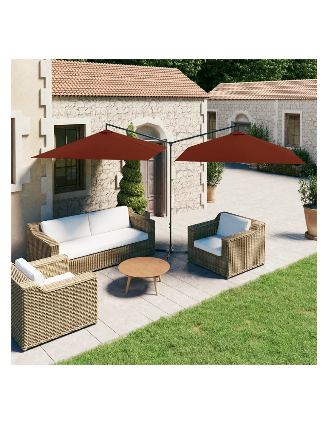 Quest'ombrellone è realizzato in poliestere, pertanto offre una protezione ottimale contro le scottature. Il robusto palo in acciaio, insieme alle rigide nervature in acciaio, mantiene stabile l'ombrellone. È dotato di una base a croce in acciaio per mantenerlo fermo in posizione. Il design con due parasole affiancati lo rende pratico, elegante e unico, e non solo offre più spazio all'ombra, ma ciò lo rende anche un elemento accattivante perfetto per qualsiasi spazio all'aperto. L'ombrellone può essere facilmente aperto e chiuso.