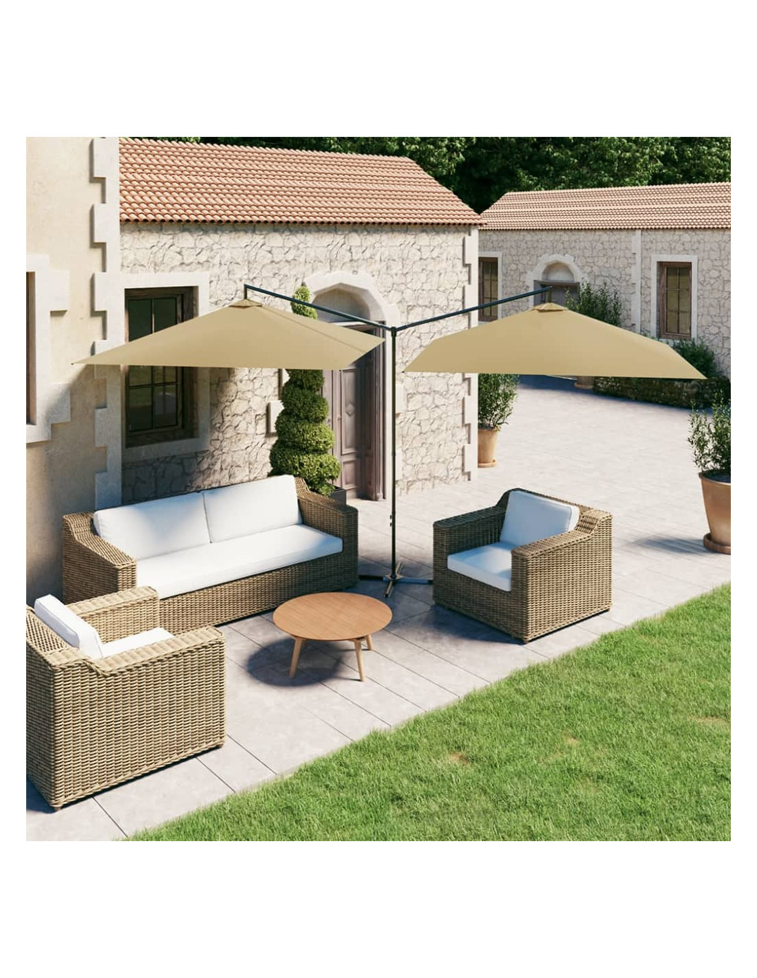 Quest'ombrellone è realizzato in poliestere, pertanto offre una protezione ottimale contro le scottature. Il robusto palo in acciaio, insieme alle rigide nervature in acciaio, mantiene stabile l'ombrellone. È dotato di una base a croce in acciaio per mantenerlo fermo in posizione. Il design con due parasole affiancati lo rende pratico, elegante e unico, e non solo offre più spazio all'ombra, ma ciò lo rende anche un elemento accattivante perfetto per qualsiasi spazio all'aperto. L'ombrellone può essere facilmente aperto e chiuso.