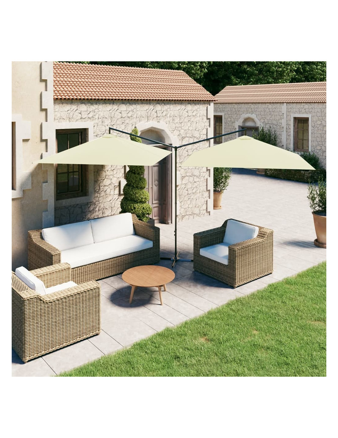 Quest'ombrellone è realizzato in poliestere, pertanto offre una protezione ottimale contro le scottature. Il robusto palo in acciaio, insieme alle rigide nervature in acciaio, mantiene stabile l'ombrellone. È dotato di una base a croce in acciaio per mantenerlo fermo in posizione. Il design con due parasole affiancati lo rende pratico, elegante e unico, e non solo offre più spazio all'ombra, ma ciò lo rende anche un elemento accattivante perfetto per qualsiasi spazio all'aperto. L'ombrellone può essere facilmente aperto e chiuso.