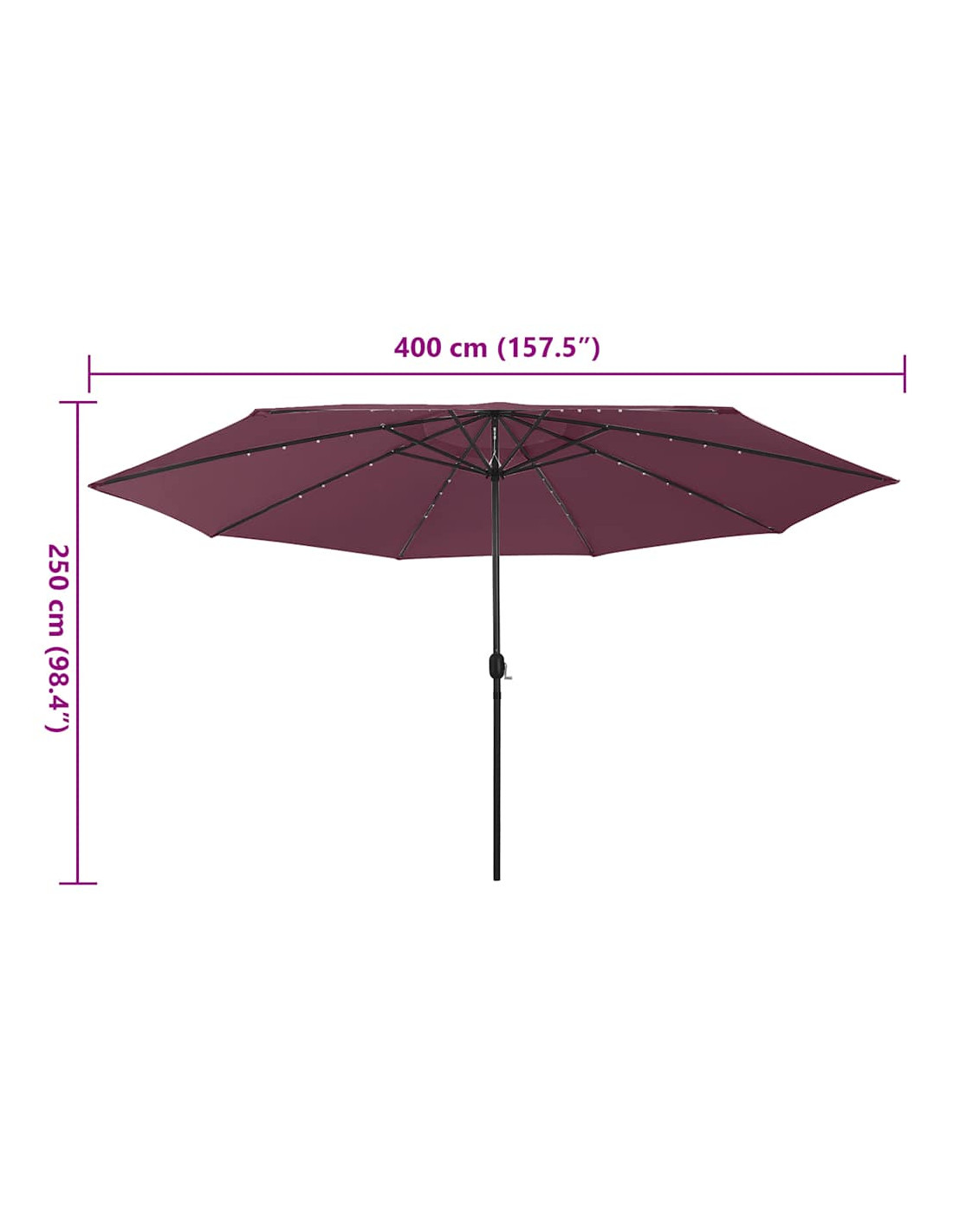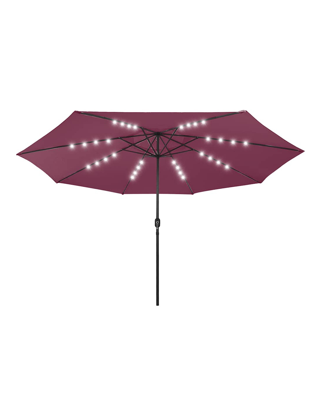 Questo ombrellone è realizzato in poliestere che garantisce una protezione ottimale contro le scottature. Il robusto palo in metallo, insieme alle stecche rigide, rende l'ombrellone stabile e robusto. È dotato di 32 LED per illuminare e creare un'atmosfera accogliente e romantica di notte. Inoltre, grazie al meccanismo a manovella, è possibile aprirlo e chiuderlo facilmente.
