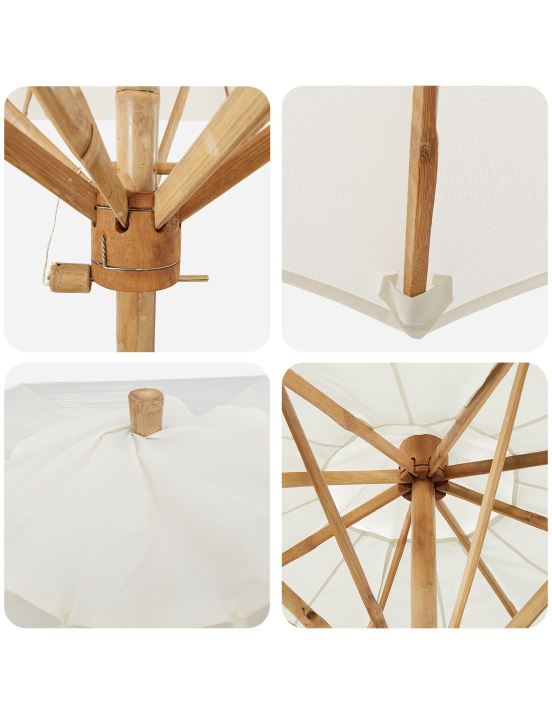 - Struttura in bambù resistente Il telaio in bambù dell'ombrellone è robusto ma leggero, quindi lo puoi spostare facilmente senza rinunciare alla solidità. Come materiale naturale, il bambù offre un aspetto rustico e resistenza alle intemperie, così puoi usarlo anche in climi ventosi o soleggiati.