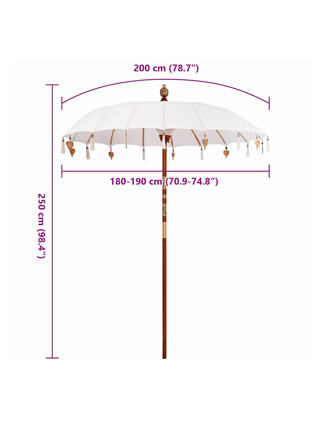 - Materiali: Con una copertura in cotone, questo parasol è leggero ma resistente, permettendo la circolazione d'aria e mantenendo un'ampia ombra. Le costole in bambù garantiscono durata e struttura solida.