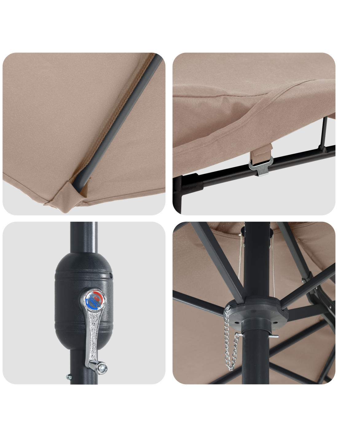 - Componenti inclusi: Questo ombrellone ha un meccanismo regolabile che rende facile sia piegarlo che conservarlo in modo compatto. Un componente chiave è la manovella a mano, che rende semplice aprire e chiudere il telo. La costruzione studiata permette un'operazione fluida, assicurando un'esperienza utente senza stress ogni volta.