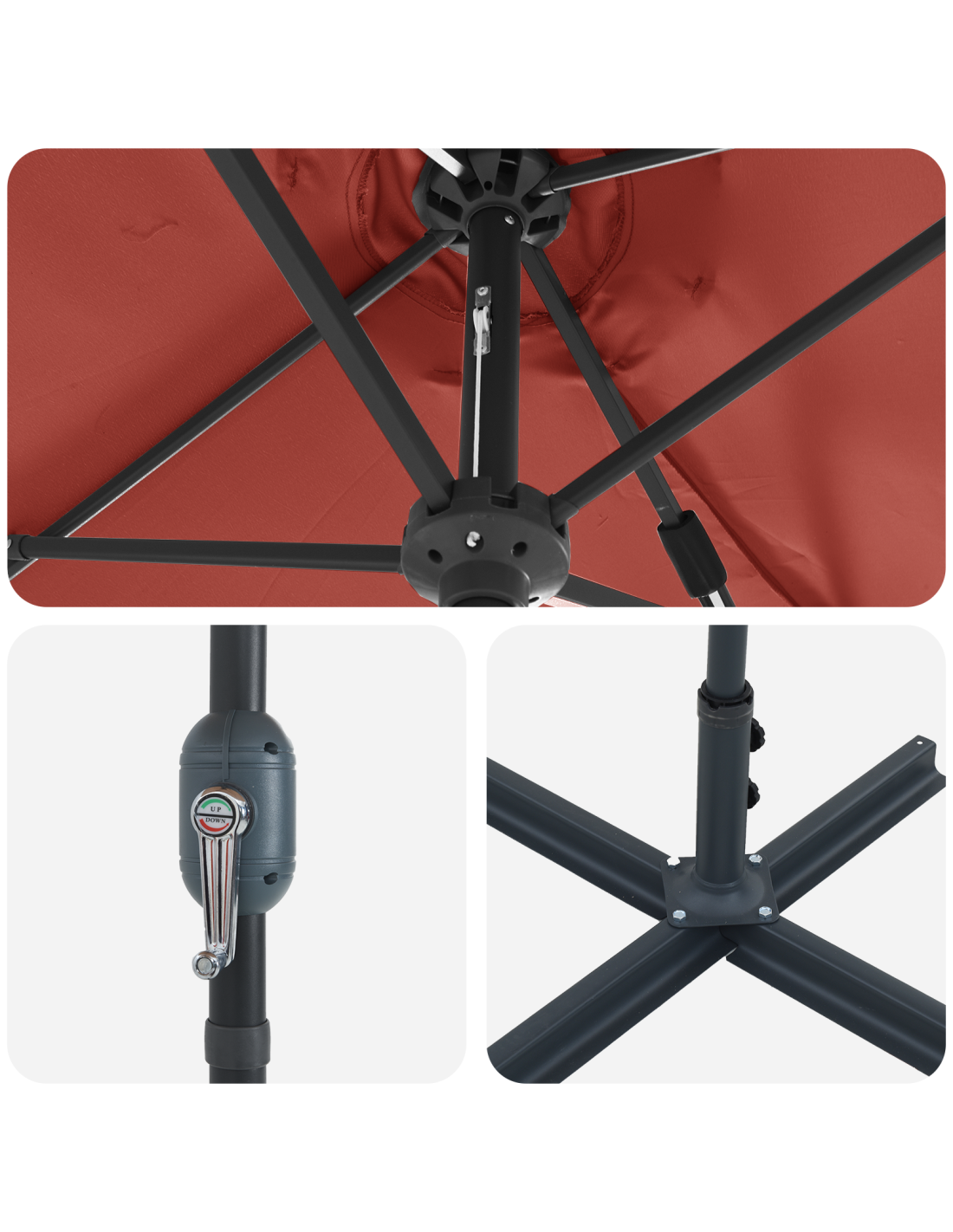 - Componenti inclusi: Ogni ombrellone viene fornito con una manovella per aprirlo e chiuderlo facilmente. Il sistema di bloccaggio assicura che rimanga in posizione, evitando chiusure accidentali.