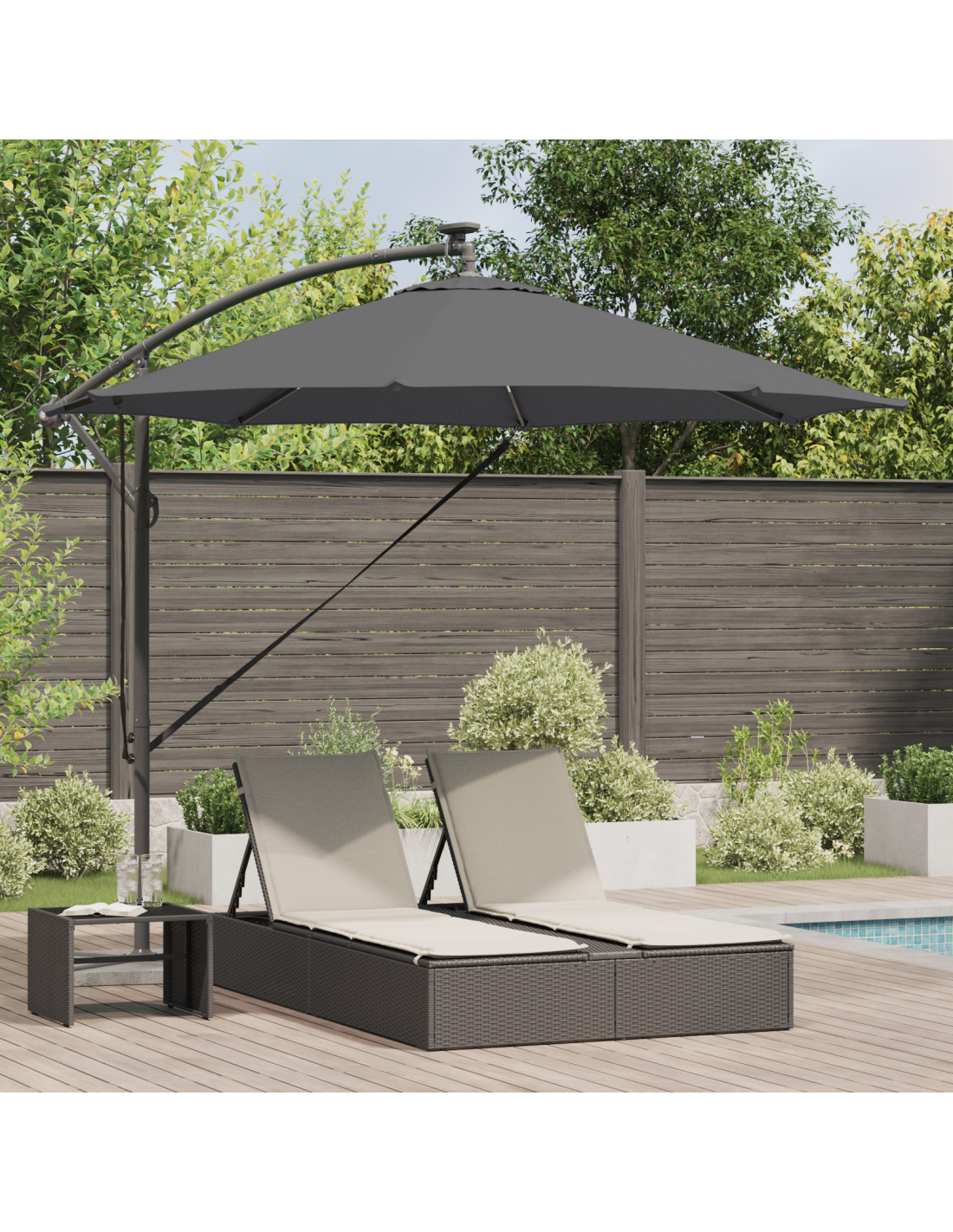 Questo ombrellone a sbalzo è un pezzo da non perdere per il tuo spazio esterno. Con un design moderno e semplice, unisce funzionalità e stile ed è perfetto per giardini, balconi e terrazzi. Si integra facilmente con il tuo arredamento esterno, offrendo sia ombra che atmosfera per le tue occasioni all'aperto.