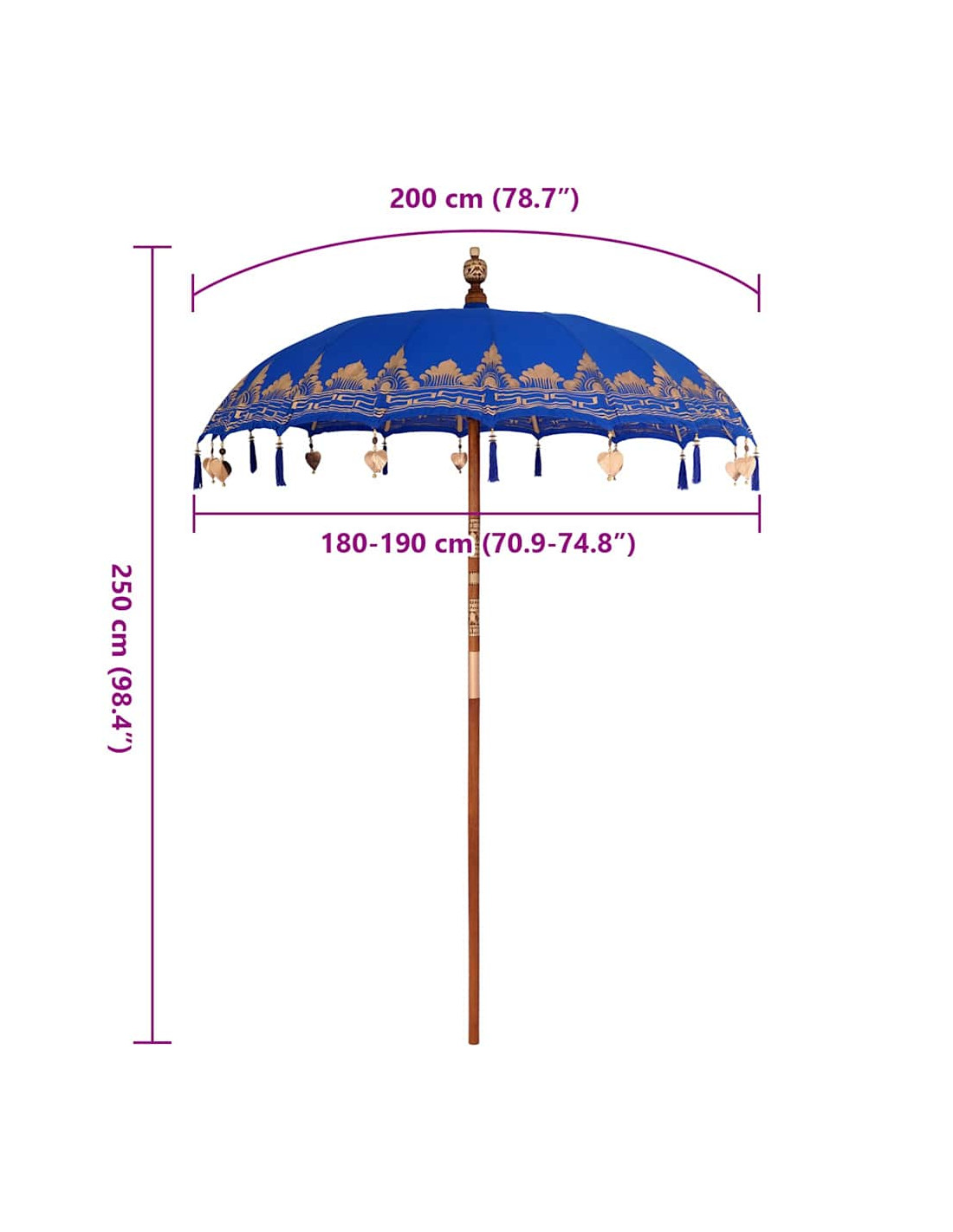 - Vibrazioni tropicali con dettagli in bambù: Le costole in bambù danno forma alla copertura, offrendole leggerezza e rigidità. Questo materiale riflette la vera essenza tropicale del parasole, in linea con lo stile balinese, che celebra la bellezza della natura. Evita di esporre il parasole a condizioni climatiche avverse, perché è progettato per l'uso estivo, offrendoti un ritiro fresco.