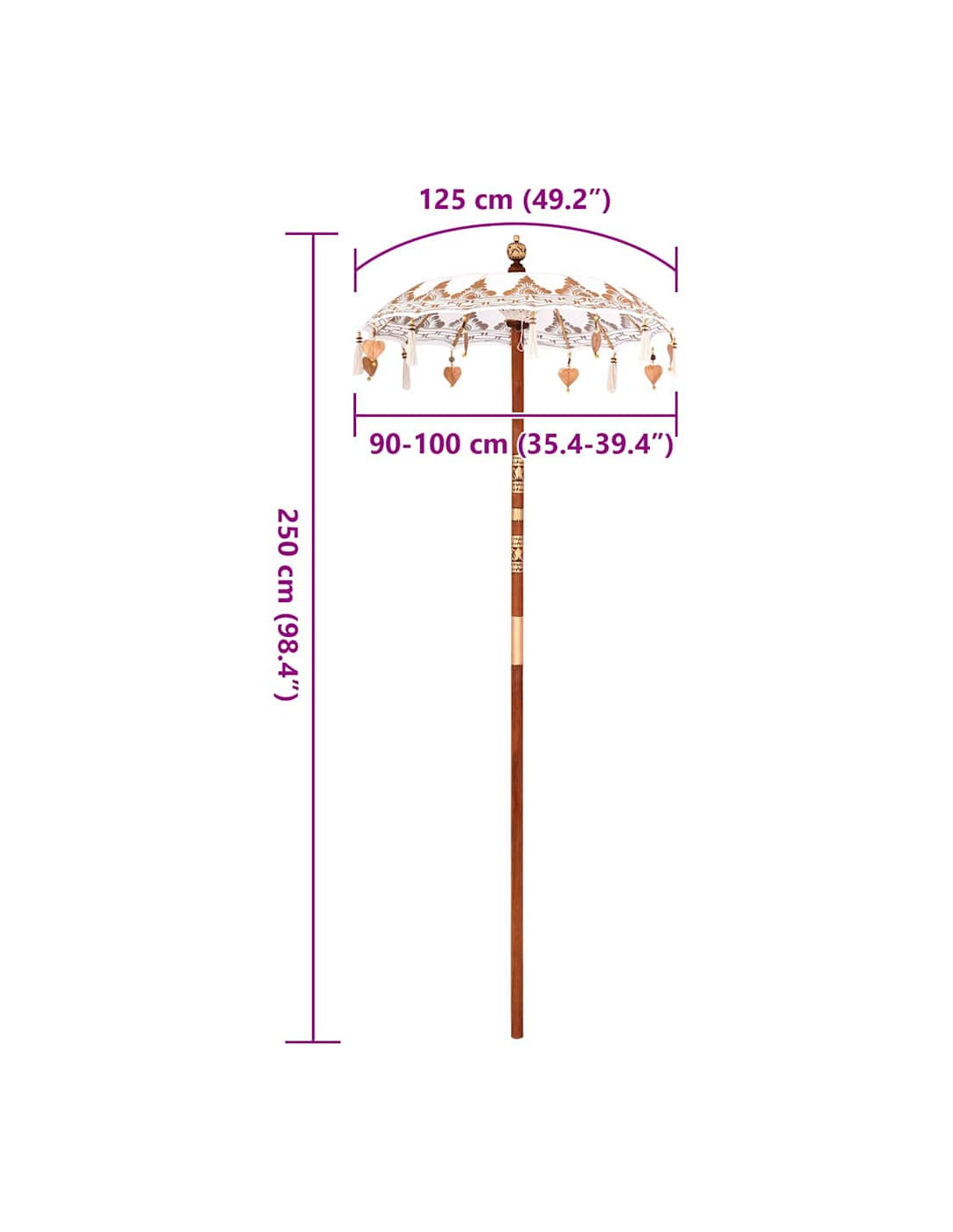 - Materiali: Questo ombrellone balinese è fatto in cotone traspirante e bambù robusto. Combina la bellezza del legno massiccio con la resistenza di una lavorazione di alta qualità. Il cotone offre una freschezza areata, mentre il bambù garantisce durata e bellezza, mantenendo ombra e resistenza anche dopo un uso prolungato.