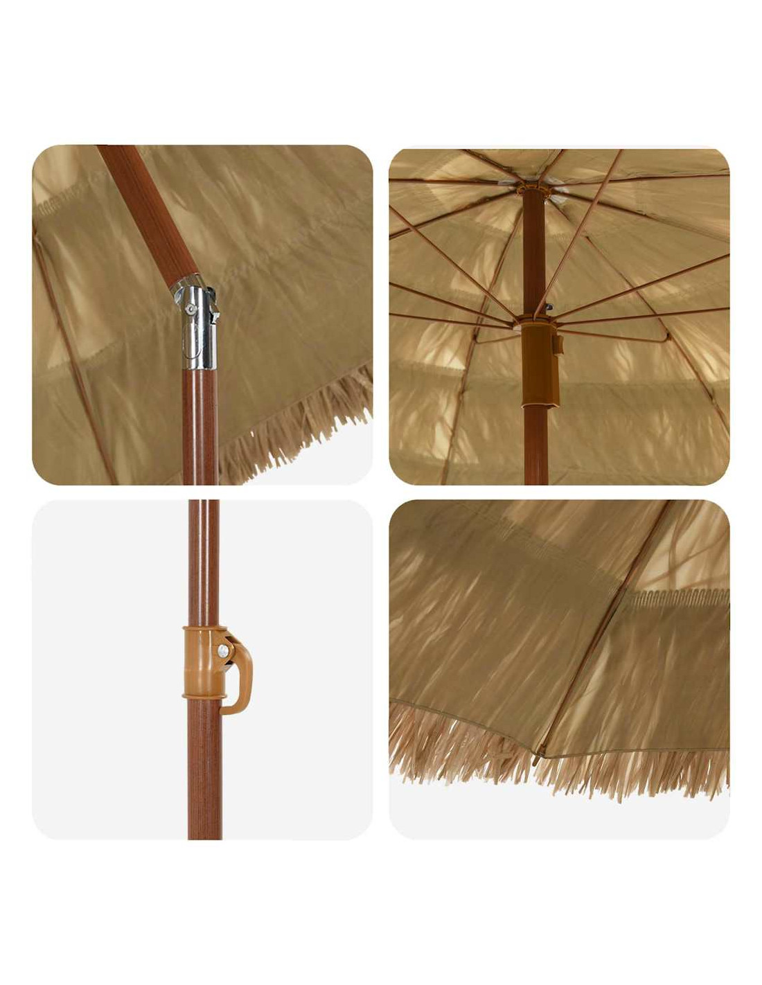 Questo ombrellone da giardino in stile hawaiano porta un tocco esotico al tuo spazio all'aperto, ideale per trasformare il tuo giardino o la tua terrazza in un angolo di paradiso. Creato per essere pratico, unisce bellezza e funzionalità. Con il suo colore naturale e stile tropicale, si adatta perfettamente a qualsiasi arredamento, offrendo un fresco rifugio sotto il suo ampio telo. Che tu stia cenando all'aperto o semplicemente rilassandoti con amici e familiari, rimarrai protetto dal sole mentre ti godi l'atmosfera tropicale.