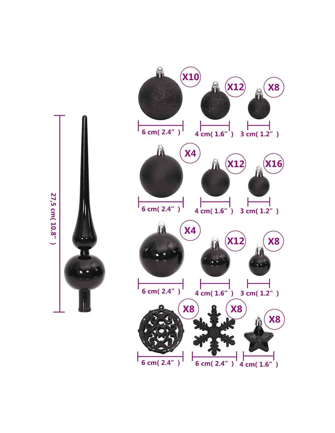 - Vari stili e dimensioni: Questa collezione di palline di Natale comprende palline di tre diametri (3 cm, 4 cm, e 6 cm), fiocchi di neve, stelle, e un puntale. Queste palline presentano quattro stili (opaco, brillantinato, lucido, e traforato).